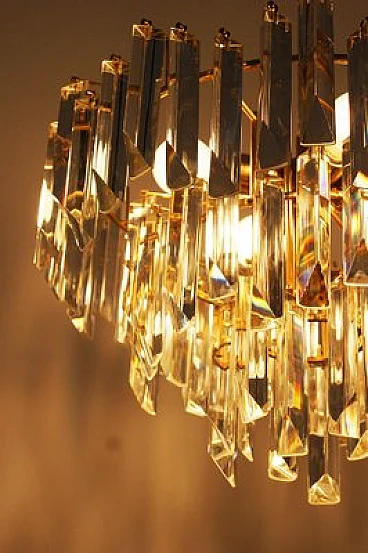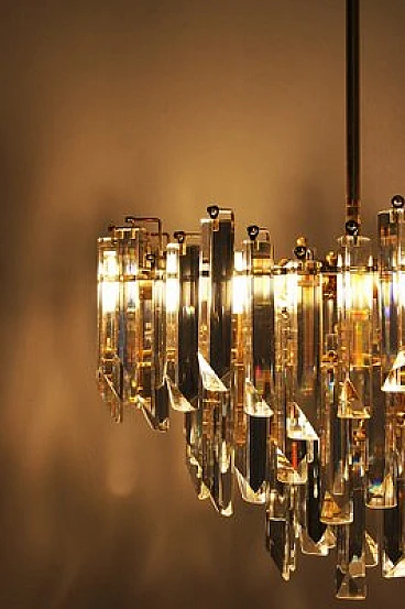 The magnificent multi-tiered Murano glass chandelier Triedri dates back to the 1970s. The chandelier lends a wonderful atmosphere to any room. It consists of 76 hand-blown crystal prisms suspended from a gold-plated metal frame and lit by four E27 bulbs. The Triedri, developed between 1958 and 1960, are solid crystal glass elements that, used as vertical modules of luminaires, can be combined in various shapes. Triedri, as a crystalline prism with a triangular cross-section, reflects light in different directions, producing a spectacular effect. Lamp circumference 158 cm.