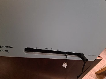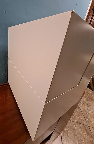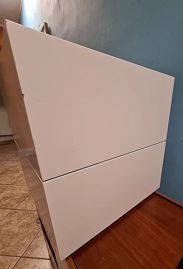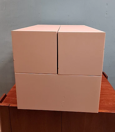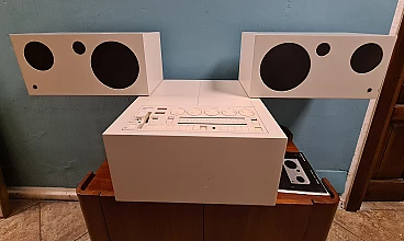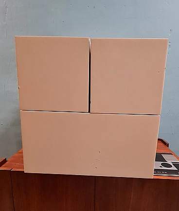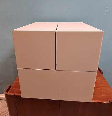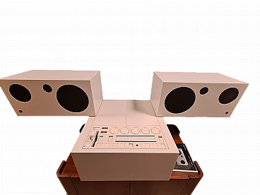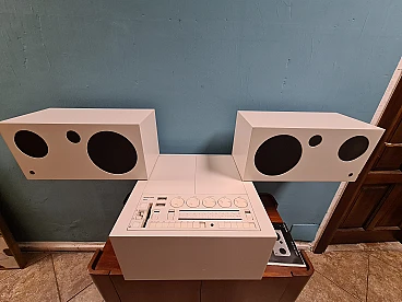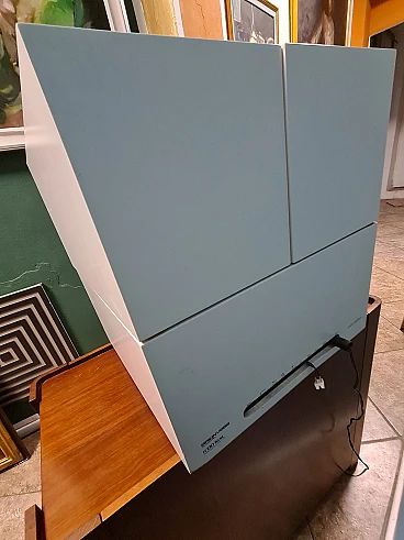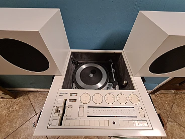 When closed, the radiophonograph looks like a cube measuring 51 cm on each side. The upper part opens and reveals the speakers which can be extracted if desired to position them further away, and the control panel. The dual turntable is protected by two removable interlocking doors and in the housing there is a push light to illuminate the controls on the turntable. From the control panel you can change and adjust the various acoustic settings and select the radio and the various stations or start the turntable.