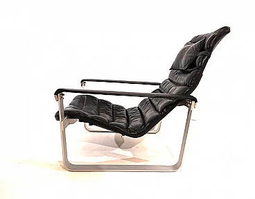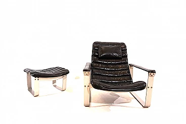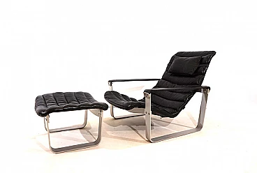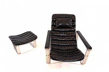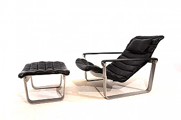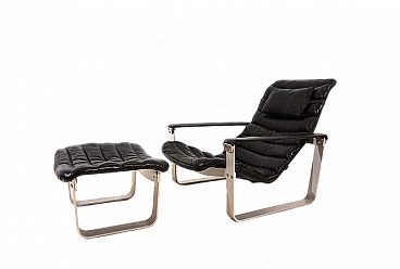 Pulkka armchair with footstool by Ilmari Lappalainen for Asko, 1960s. The armchair is, as is the footstool, in very good condition. The black leather is soft and intact, the stitching is all in order. The seat structure is made of aluminum and is adjustable in different ways. The structure shows minimal signs of wear. In combination with the footstool, the Pulkka armchair offers a fantastic sitting experience. Finnish designer Ilmari Lappalainen designed this armchair for Asko Finland in the late 1960s, creating a design classic. Finnish furniture manufacturer Asko was founded in 1919 and made a name for itself in the 1960s-70s by collaborating with top designers and creating innovative designs. Seat height: 27 cm. Seat depth: 55 cm.