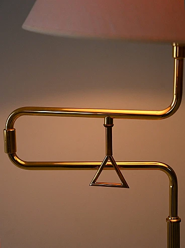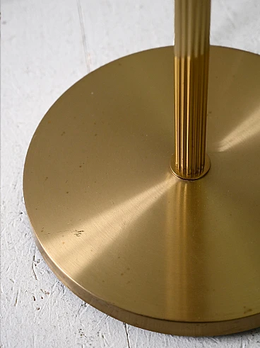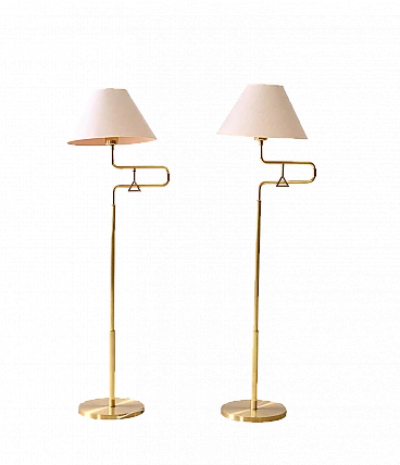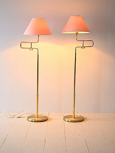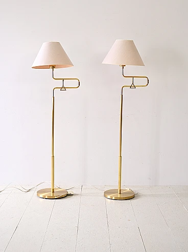 Pair of Scandinavian floor lamps, 1960s-70s. The white fabric shades diffuse warm, inviting light, while the gilded metal structures add a touch of timeless luxury. The adjustable design offers flexibility, allowing the light to be directed as needed. With their sleek silhouette and elegant finish, these lamps fit into a variety of living settings, diffusing not only light but also a legacy of Scandinavian style. Good condition, a conservative restoration with natural products has been carried out. They may show some signs of time. Please pay attention to the photographs.