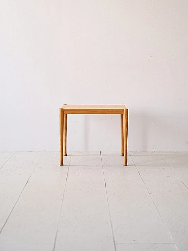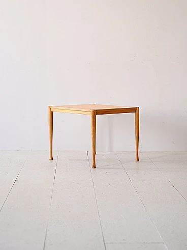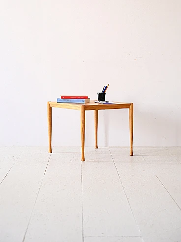 Scandinavian oak coffee table with square top, 1960s-70s. It stands out for its essential shape and minimalist elegance. Thanks to its small size, it is perfectly suited for use as a bedside table or as a versatile support surface. The clean design makes it ideal as a pocket emptier at the entrance, as a functional element in the living room or as a touch of refinement in the bedroom, demonstrating that style does not require excess to be appreciated. Good conditions; a conservative restoration was carried out with products of natural origin. It may show some signs of time. Please pay attention to the photographs.