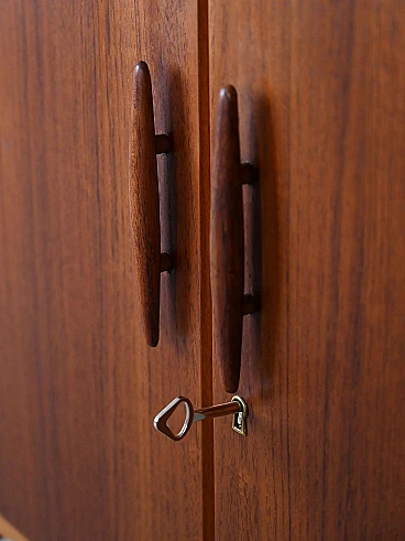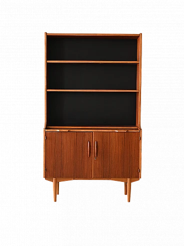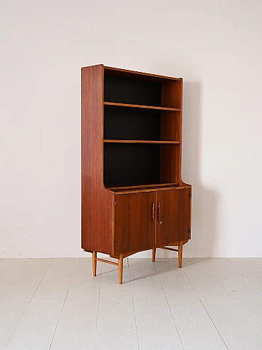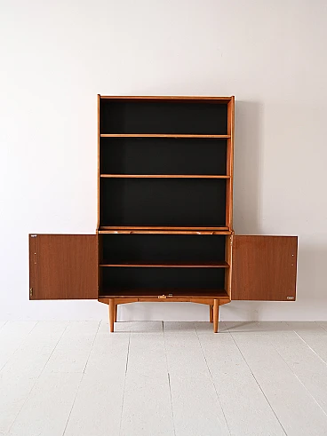 Scandinavian teak bookcase with extractable shelf, 1960s. This piece of furniture, thanks to the extractable shelf and the storage compartment closed by the hinged doors, offers functionality and style in a compact space. The open shelves are suitable for displaying books and art objects while the lower storage compartment adds an element of privacy and order. The structure, supported by tapered legs, reflects the craftsmanship and attention to detail of the period. A refined addition to any interior seeking a balance between aesthetics and everyday practicality. Good conditions; a conservative restoration was carried out with products of natural origin. It may show some signs of time. Please pay attention to the photographs.