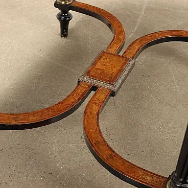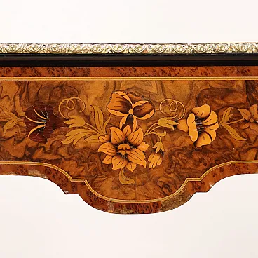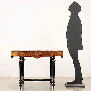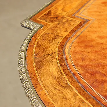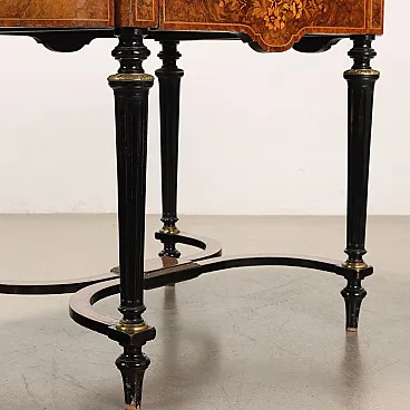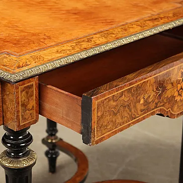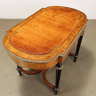 Writing Desk WM. JOHNSON & SON burl walnut and maple veneer, Sheffield ca. 1870. Shaped top with leather insert and gilded bronze ribbed edge, band with drawer and fake drawer on the long sides, ebonized fluted truncated cone legs adorned with gilded bronze inserts and connected to each other by curved crosspieces with a central shelf; pear-shaped feet. The decorative arrangement is completed by maple threads and floral inlays in maple and mahogany. Mahogany and fir interior. Inside the drawer there is the original label from the manufacturer.