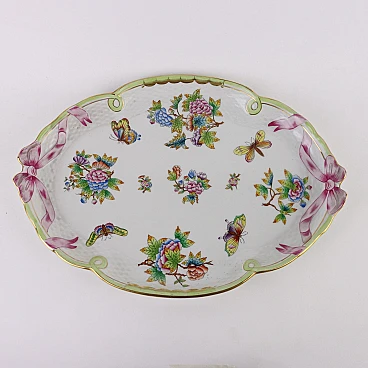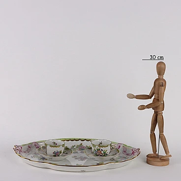 Tray and two cups and saucers in hand-painted porcelain. "Queen Victoria" decoration composed of butterflies flying among cut sprigs of magnolias, peonies and other exotic flowers. Light green border with gold highlights and side grips decorated with a bow in shades of pink. Under the bases the manufacturing brand.