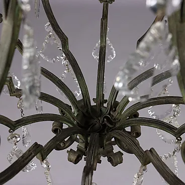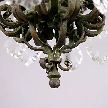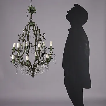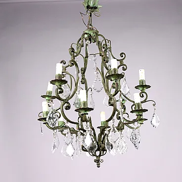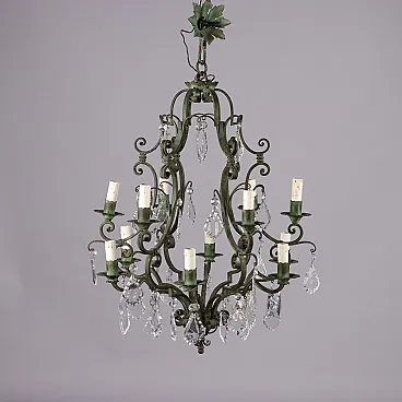 Twelve-light chandelier in painted wrought iron. 20th century, Italy. Glass pendants.