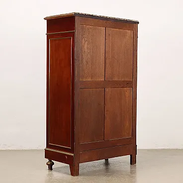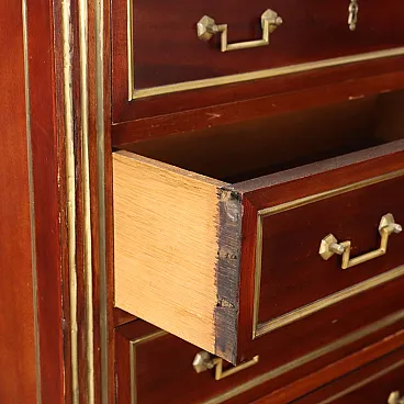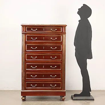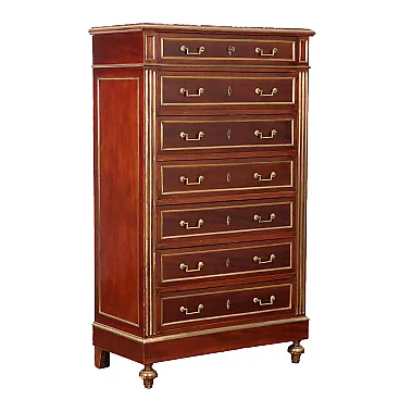 Mahogany tallboy, France first half of the 20th century. Recessed marble top, seven drawer front, grooved uprights, spinning top front feet. Entirely adorned with golden sheet metal frames and profiles. Oak interior.