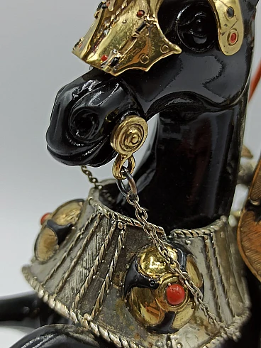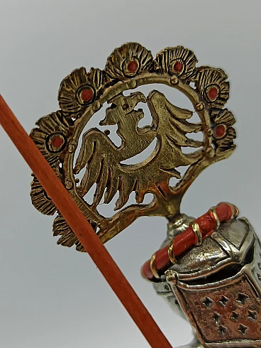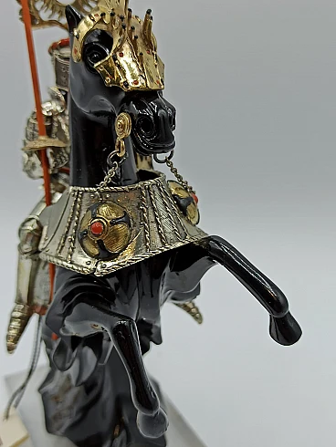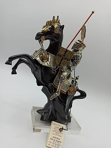 Sculpture of a knight with handcrafted silver harnesses by Etruria - Arte in Argento, 1960s-70s. Silver, pure gold, enamels and the work of master craftsmen used to create unique works. The subject harks back to the knights of Renaissance myth. Etruria - Arte in Argento was founded in 1962 in Florence by master silversmiths determined to revisit the best of the Florentine goldsmithing tradition and to reproduce in a modern key the work experience that Florentine masters have handed down for centuries. Total weight: 704 grams.
