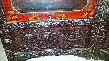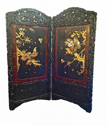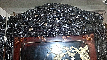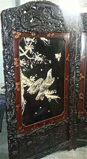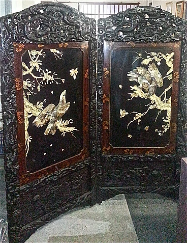 Chinese lacquer and carved wood screen with mother-of-pearl applied elements, 19th century. In need to be completed with restoration, some parts are in fact missing.