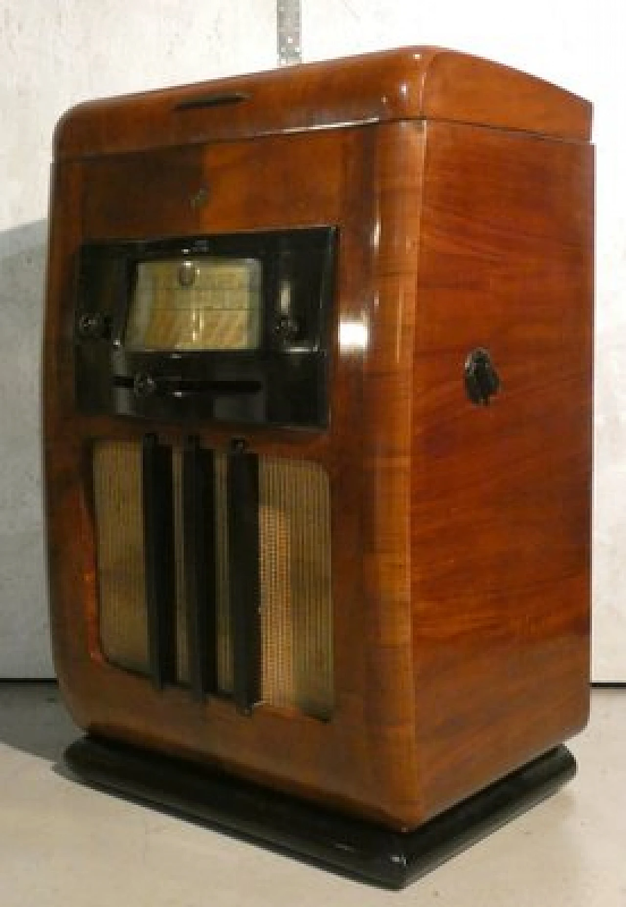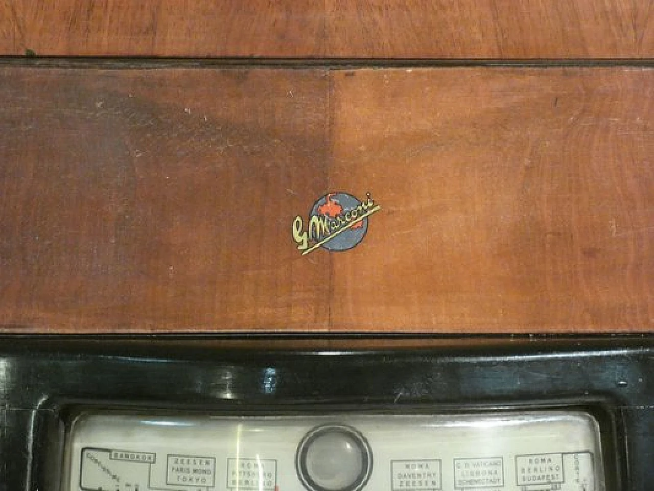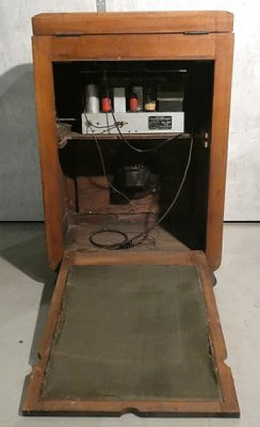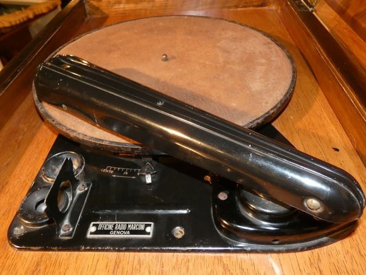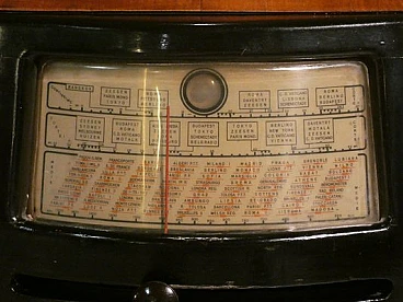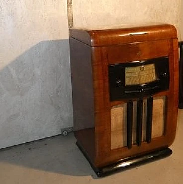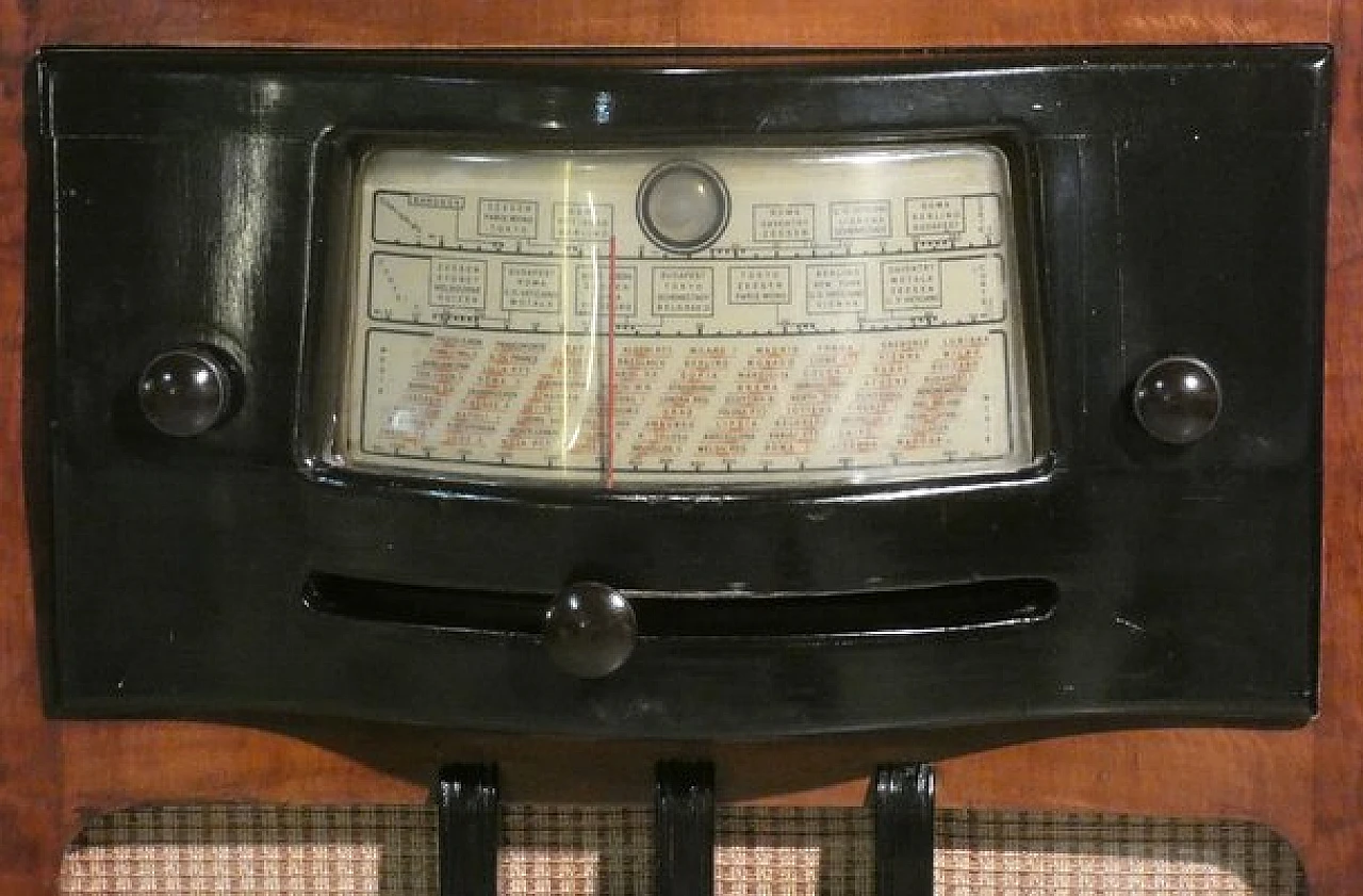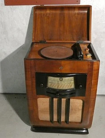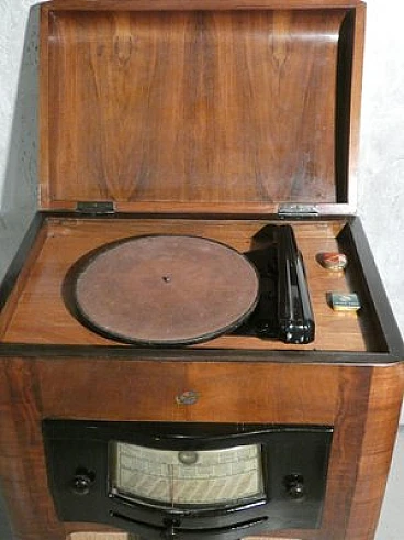Wood and bakelite radio cabinet with record player mod. Marconi 1562 by Marconi Company (La Voce del Padrone, Columbia and Marconiphone), 1940-1941. A piece of Italian Navy and Merchant Marine history. Oak wood cabinet and refined electronics for a radio that was able to accompany the sailors of the golden era of the Modern Navy. The precious lacquered steel turntable with all-bakelite arm completed the system. In its early days, the Marconi Company counted among its first "institutional" customers the Merchant and Military Navies, to which the transceiver equipment it produced was leased ("modern leasing") including operating personnel for the civilian sector only. This involved having training schools allocated at the Marconi Workshops, as in Genoa. In 1928 His Master's Voice (USA), known in Italy as "La Voce del Padrone" (plants in Milan) and which produced gramophones and records, realized that radio would dangerously alter the size of its target market. He decided to buy England's Marconiphone, to quickly supplement the range of products to be offered, including radio sets. Of course, the larger and more powerful company of the two was His Master's Voice, which imposed its own production and design standards, which were very much oriented toward mass standardization. Moreover, the production of a model could be manufactured in one country and marketed anywhere (His Master's Voice, for example, controlled the Pathè brand in France). In Italy, production also included the Columbia brand. Civilian production activity ceased, in Italy, in the late 1960s. Model: Marconi 1562 - La Voce del Padrone. Manufacturer/Brand: La Voce del Padrone, Milan, Italy. Number of tubes: five. Valves general principle: Superheterodyne (in general); ZF/IF 465 kHz. Wave ranges: medium wave (OM) and two short wave ranges (2 x OC). Special features: turntable (not record changer). Operating voltages: alternating current (AC) power supply / 110-275 volts. Speaker: electrodynamic AP (voice coil and excitation/field coil). Console Form: Chairside Radio. Annotations: synthesized series.