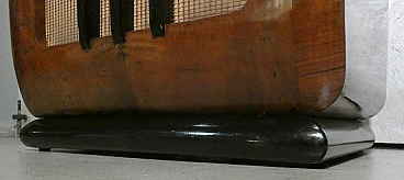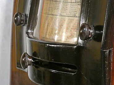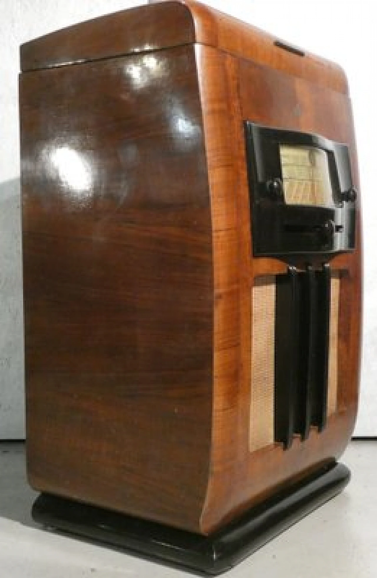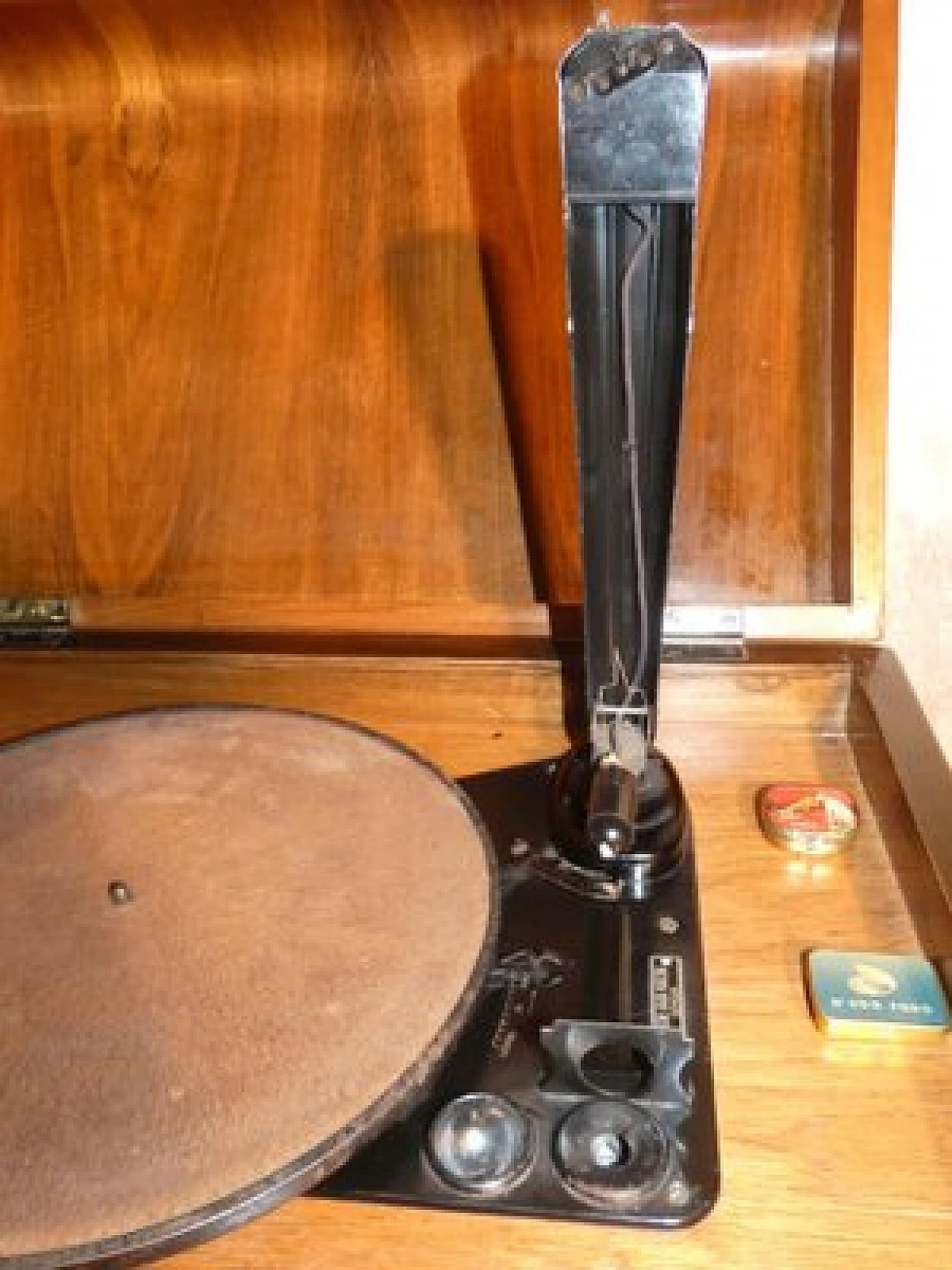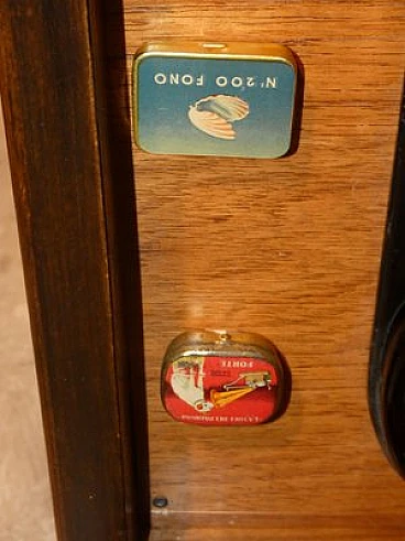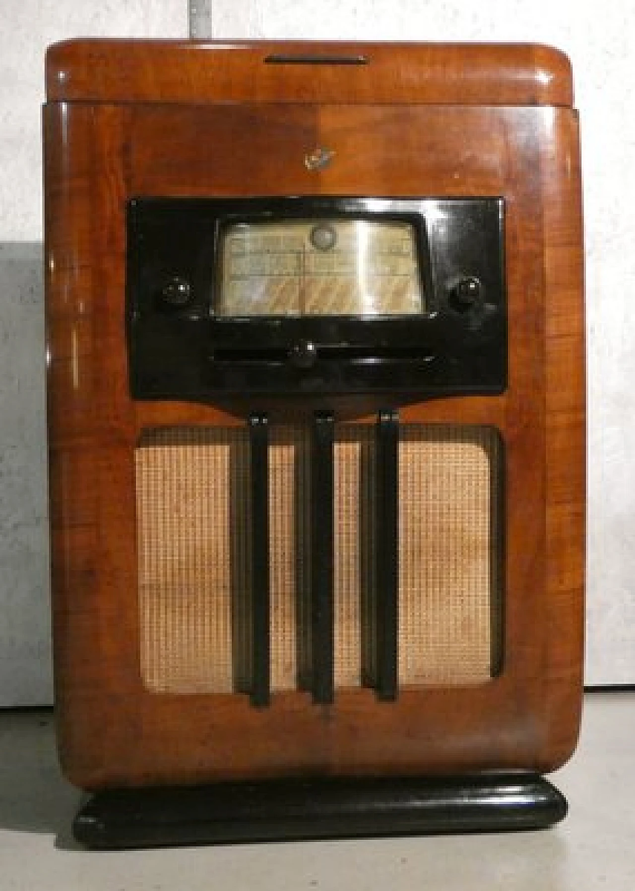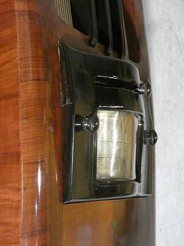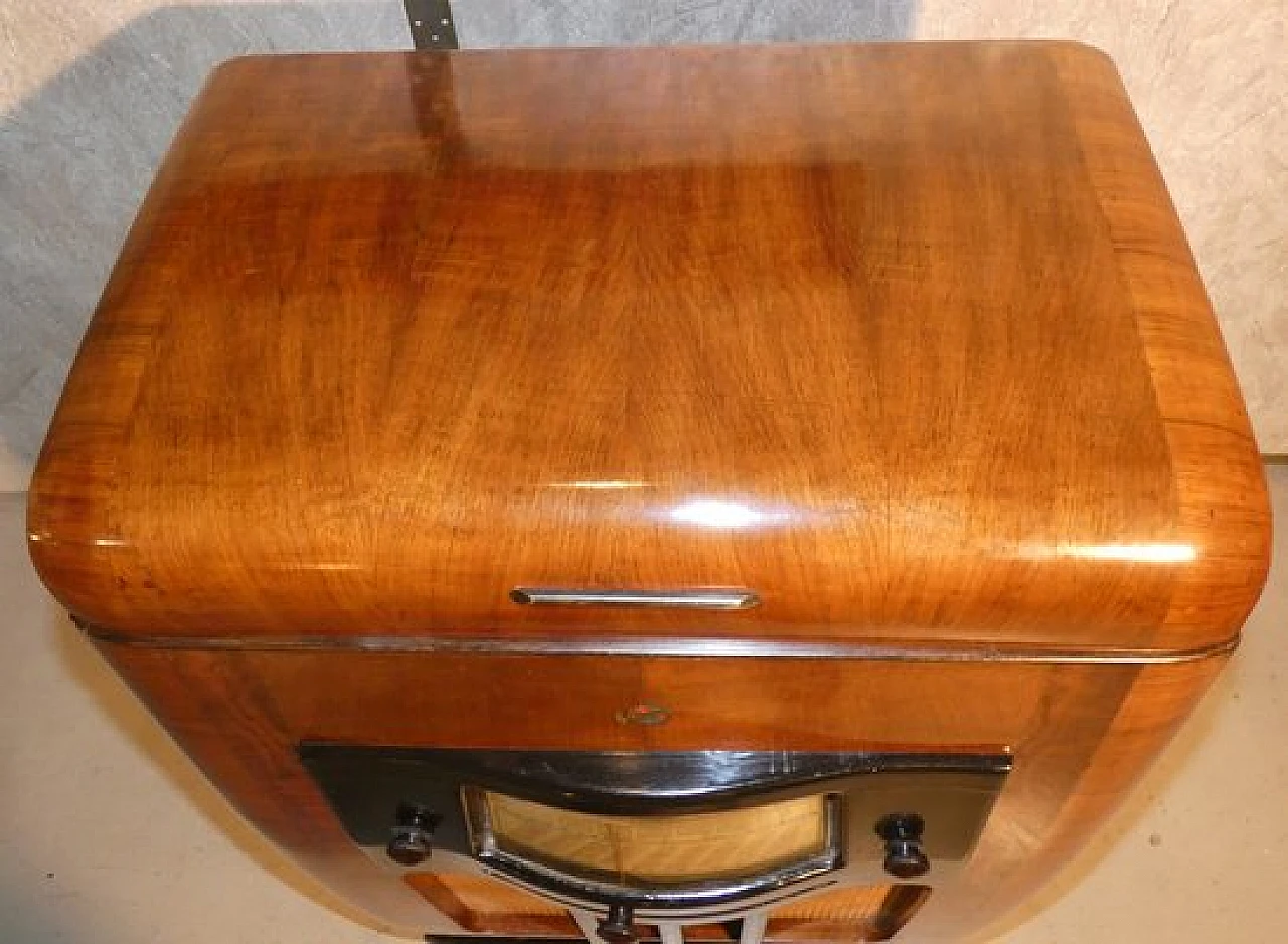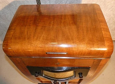 Wood and bakelite radio cabinet with record player mod. Marconi 1562 by Marconi Company (La Voce del Padrone, Columbia and Marconiphone), 1940-1941. A piece of Italian Navy and Merchant Marine history. Oak wood cabinet and refined electronics for a radio that was able to accompany the sailors of the golden era of the Modern Navy. The precious lacquered steel turntable with all-bakelite arm completed the system. In its early days, the Marconi Company counted among its first "institutional" customers the Merchant and Military Navies, to which the transceiver equipment it produced was leased ("modern leasing") including operating personnel for the civilian sector only. This involved having training schools allocated at the Marconi Workshops, as in Genoa. In 1928 His Master's Voice (USA), known in Italy as "La Voce del Padrone" (plants in Milan) and which produced gramophones and records, realized that radio would dangerously alter the size of its target market. He decided to buy England's Marconiphone, to quickly supplement the range of products to be offered, including radio sets. Of course, the larger and more powerful company of the two was His Master's Voice, which imposed its own production and design standards, which were very much oriented toward mass standardization. Moreover, the production of a model could be manufactured in one country and marketed anywhere (His Master's Voice, for example, controlled the Pathè brand in France). In Italy, production also included the Columbia brand. Civilian production activity ceased, in Italy, in the late 1960s. Model: Marconi 1562 - La Voce del Padrone. Manufacturer/Brand: La Voce del Padrone, Milan, Italy. Number of tubes: five. Valves general principle: Superheterodyne (in general); ZF/IF 465 kHz. Wave ranges: medium wave (OM) and two short wave ranges (2 x OC). Special features: turntable (not record changer). Operating voltages: alternating current (AC) power supply / 110-275 volts. Speaker: electrodynamic AP (voice coil and excitation/field coil). Console Form: Chairside Radio. Annotations: synthesized series.