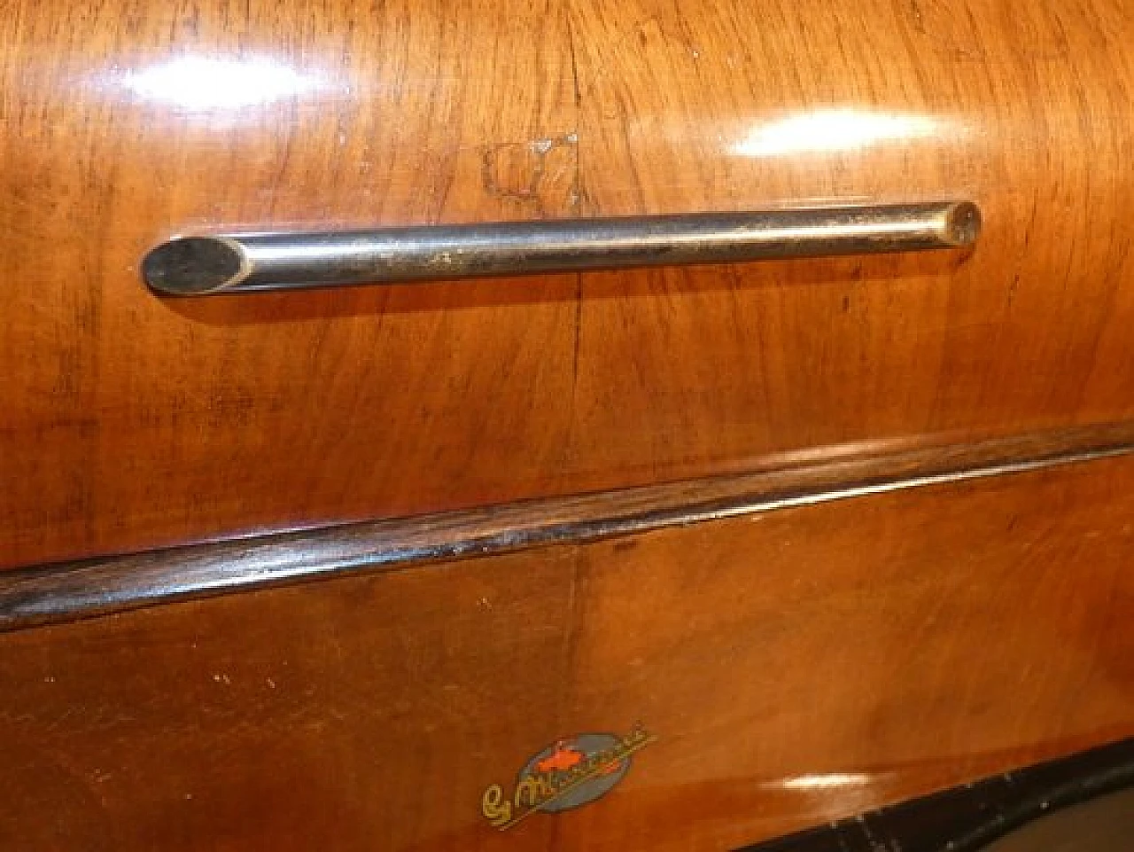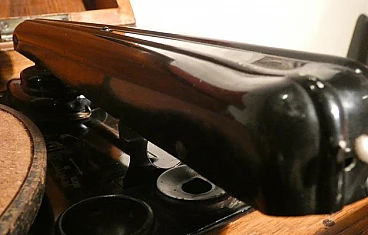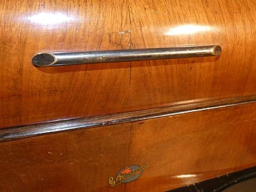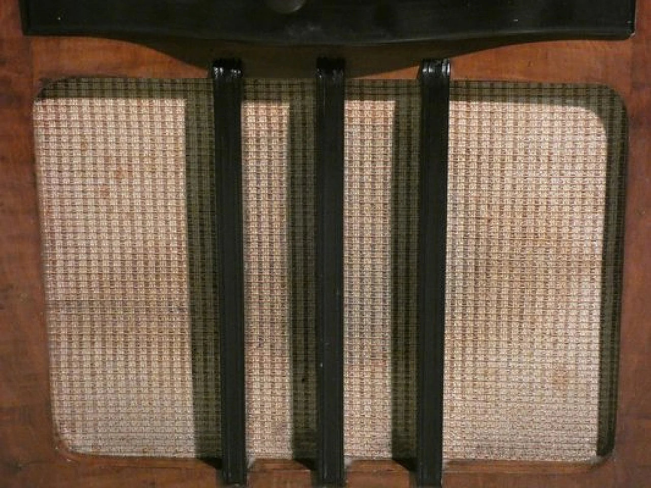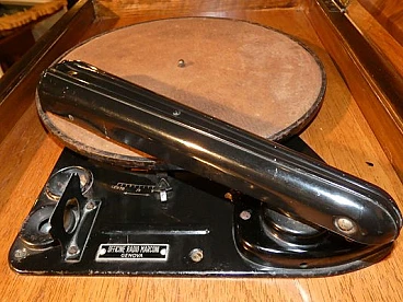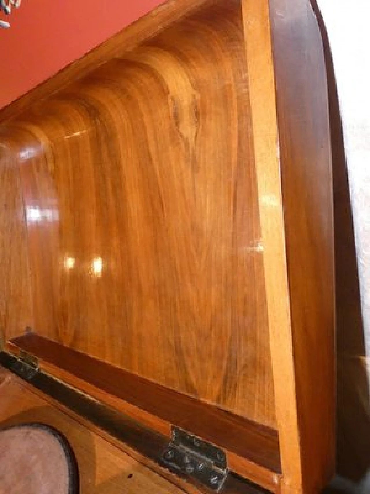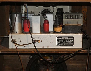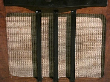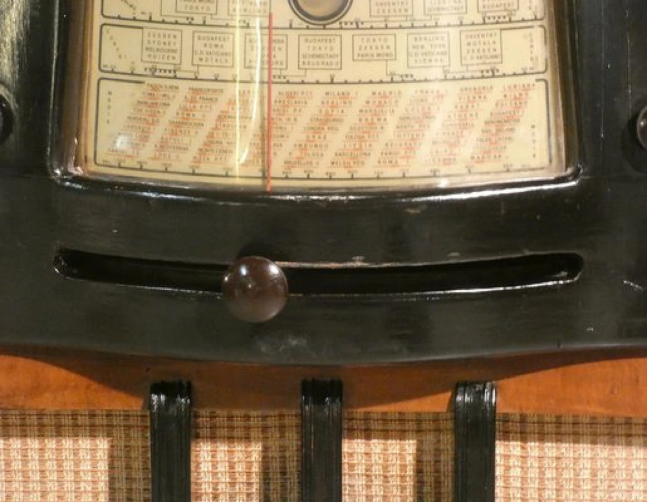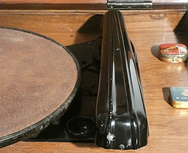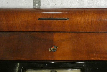 Wood and bakelite radio cabinet with record player mod. Marconi 1562 by Marconi Company (La Voce del Padrone, Columbia and Marconiphone), 1940-1941. A piece of Italian Navy and Merchant Marine history. Oak wood cabinet and refined electronics for a radio that was able to accompany the sailors of the golden era of the Modern Navy. The precious lacquered steel turntable with all-bakelite arm completed the system. In its early days, the Marconi Company counted among its first "institutional" customers the Merchant and Military Navies, to which the transceiver equipment it produced was leased ("modern leasing") including operating personnel for the civilian sector only. This involved having training schools allocated at the Marconi Workshops, as in Genoa. In 1928 His Master's Voice (USA), known in Italy as "La Voce del Padrone" (plants in Milan) and which produced gramophones and records, realized that radio would dangerously alter the size of its target market. He decided to buy England's Marconiphone, to quickly supplement the range of products to be offered, including radio sets. Of course, the larger and more powerful company of the two was His Master's Voice, which imposed its own production and design standards, which were very much oriented toward mass standardization. Moreover, the production of a model could be manufactured in one country and marketed anywhere (His Master's Voice, for example, controlled the Pathè brand in France). In Italy, production also included the Columbia brand. Civilian production activity ceased, in Italy, in the late 1960s. Model: Marconi 1562 - La Voce del Padrone. Manufacturer/Brand: La Voce del Padrone, Milan, Italy. Number of tubes: five. Valves general principle: Superheterodyne (in general); ZF/IF 465 kHz. Wave ranges: medium wave (OM) and two short wave ranges (2 x OC). Special features: turntable (not record changer). Operating voltages: alternating current (AC) power supply / 110-275 volts. Speaker: electrodynamic AP (voice coil and excitation/field coil). Console Form: Chairside Radio. Annotations: synthesized series.