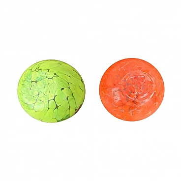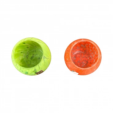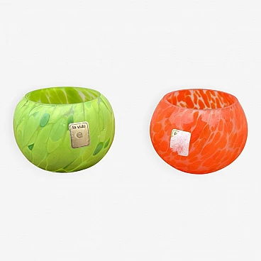 Pair of pretty La Vida glass candleholders, handmade in Western Europe in the second half of the 20th century. The object can also be used as a small flower vase. Orange and green coloured glass. Unique mid-century modern glass art, very elegant and practical for orchids. Object in perfect condition, never used, with preserved signature sticker. Colour: green, orange, red, transparent Style: mid-century modern, modernism, organic modernism, Italian modernism Material: glass. Dimensions: height 9 cm | diameter 11 cm. Dimensions in inches: height 3.5 in | diameter 4.3 in.