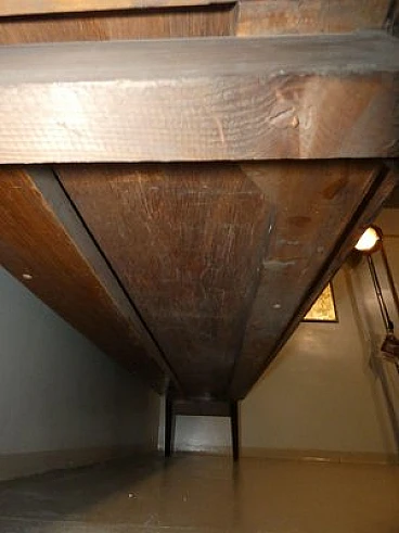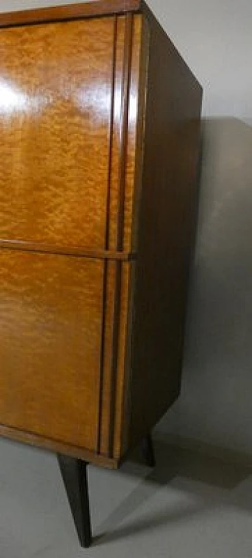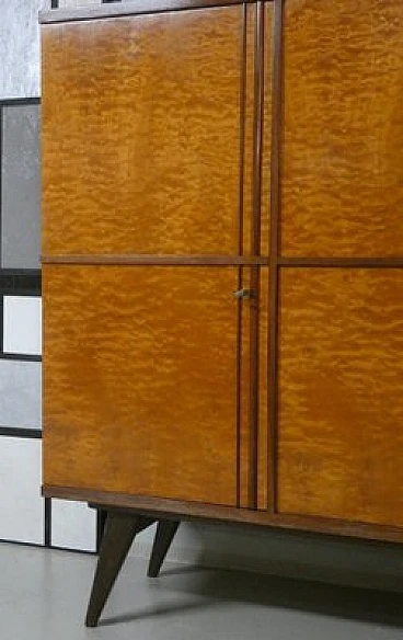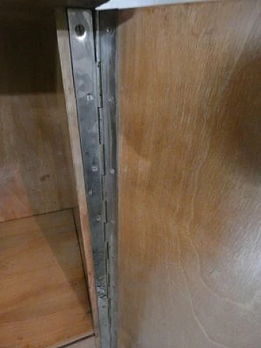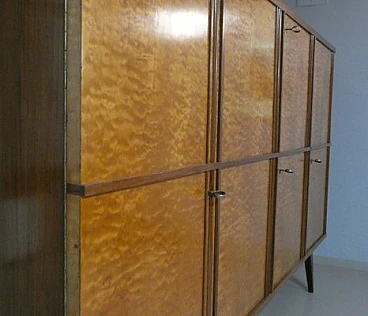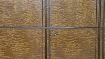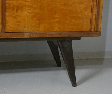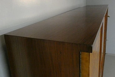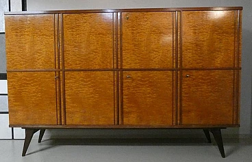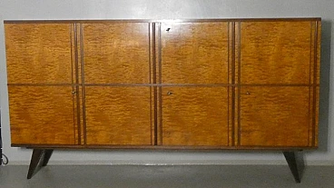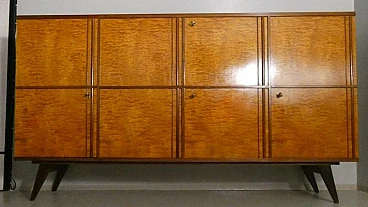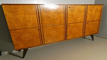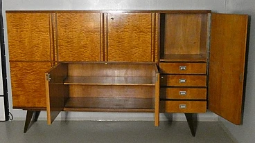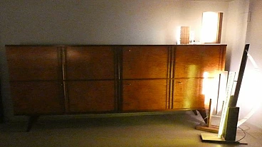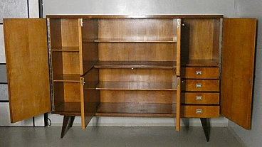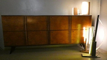 Large sideboard made of solid teak wood, handcrafted in the 1970s in Italy. An extremely storable piece of furniture, the sideboard also has four drawers with steel handles. Looking at the sideboard from the front, on the left-hand side, there is a single full-height hinged door with a shelf compartment. The central portion is divided between the upper and lower parts, both with hinged doors, and finally the right-hand sideboard also has a full-height hinged door containing the drawers in the lower part and the shelves in the upper part. Original hardware and brass keys. The honey-coloured tone of the wood is extremely elegant. Unusual is the 'square' motif that stands out when all the doors are closed. The cabinet is suitable for placement in various rooms. Beautiful in a dining or living room, elegant in a living room and original in a bedroom The cabinet has been polished and does not require restoration. Dimensions: H. 142 cm - W. 220 cm - D. 45 cm.