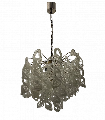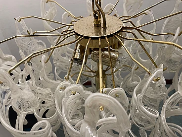 Murano glass chandelier by Mazzega, 1970s. It consists of hand-blown white Murano glass spiral-shaped elements hanging on a brass structure. The brass shows signs of time. Height without chain: 50 cm. Height including chain: 110 cm. It has five lights and requires E27 bulbs. New wiring installed compatible with EU, UK, USA. Weight: between 40 kg and 80 kg.