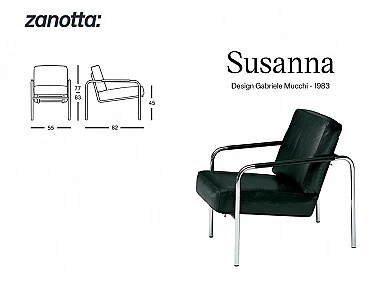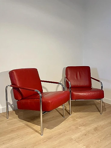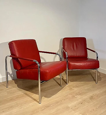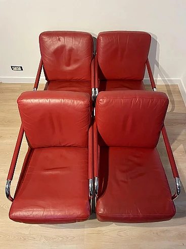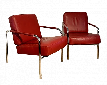 Pair of Susanna armchairs by Gabriele Mucchi for Zanotta. Designed in 1983 by the great and multifaceted Turinese engineer, designer and painter Gabriele Mucchi (1899 - 2002), father of the famous Genni lounge chair. Two pairs of chairs available (price per single pair). All in excellent condition with minimal signs of limited use. Used mostly as a piece of furniture at an architectural firm; they have always been kept in excellent condition. Spectacularly comfortable, giving relaxation of the highest order. Chrome-plated steel tube support structure. Black painted steel cushion frame, adjustable to two positions. Cushion padding in polyurethane/thermal-bonded polyester fiber. Removable cushion covers in soft red leather (Leather 95-0300). Lower leg tips made of black hard plastic.