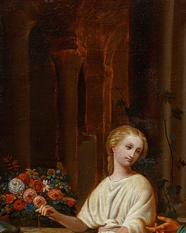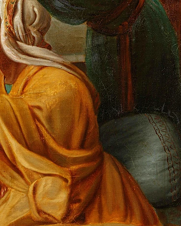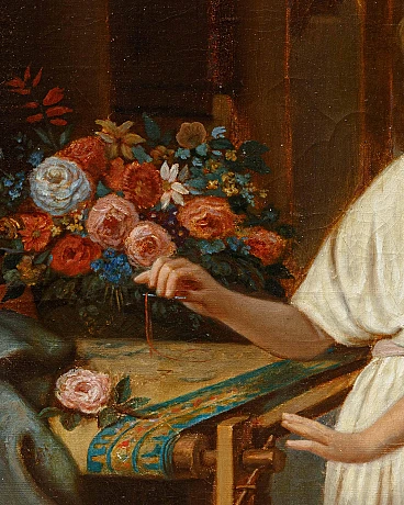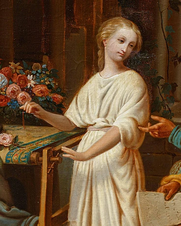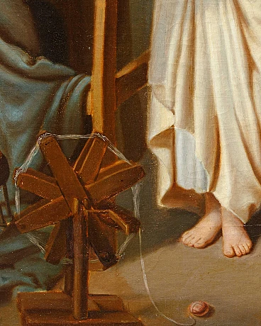 François-Barthélemy-Marius Abel (Marseille, 1832 - Paris, 1870), Scene with spinner, oil on canvas, unframed 91 x 71 cm, framed 120 x 100 cm. Signed and dated 'F. Barthelemy 1876'. A young girl is depicted standing in front of a loom, while an old woman with notes in her hand seems to be teaching her how to work as a weaver. Behind, a woman draws back the curtain revealing an architectural backdrop and ruin-like colonnades acting as a scenic backdrop. The painting, an oil on canvas, is signed and dated 'F. Barthelemy 1876' and can therefore be traced back to the body of work of François-Barthélemy-Marius Abel, an artist born in Marisglia on 28 February 1832 and who died in Paris on 11 September 1870. He trained in Lyon where he was a pupil of both Claude Bonnefond and Léon Cogniet, an artist, the latter, who studied alongside Gericault and Delacroix. Barthélemy was particularly concerned with religious and history painting, a genre of which the painting The Death of the Duke of Anjou, son of Henri II, dated 1863 and preserved in Blois at the Château Museum is an example. Other works of his can be found in private collections such as: The French Empire before the House of Savoy; Lady in an Interior; The Three Marys at the Sepulchre.