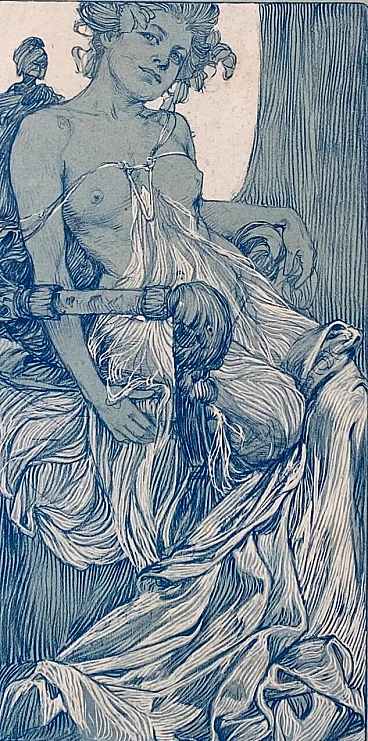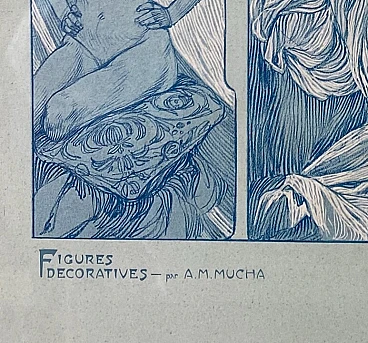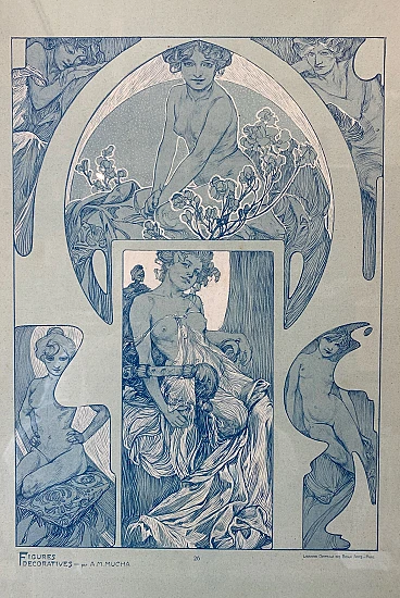 Alfons Maria Mucha (Ivančice 1860 - Prague 1939) was a painter, sculptor and illustrator who played a leading role in Art Nouveau. An early draughtsman, he first worked in Vienna for an important theatre company, then in Mikulov as a portrait painter. Here Count Belasi commissioned him to decorate his residences and became his patron, Mucha was thus able to attend the Academy of Fine Arts in Munich. He continued his studies in Paris at the Julian Academy and at the Académie Colarossi, coming into contact with artists such as Gauguin, Claudel and Collin. In 1889 he began working as an illustrator for magazines and advertising posters. Henri Boullerier, director of the weekly Le Petit Français Illustré, hired him regularly. By then already a recognised artist, in 1894 he produced a poster for Victorien Sardou's play Gismonda that radically changed his life. Thanks to the poster, actress Sarah Bernhardt becomes a public icon and decides to sign a six-year contract with Mucha. With six more posters in the public eye, both artists became absolute protagonists of Art Nouveau. Table no. 26 from Figures decoratives par A M Mucha, Paris, Emil Levy editeur, 1905. Album of forty lithographs reproducing as many drawings by the author. Fresh impression in excellent condition. Mounted in a period gilt frame with plant motif.
