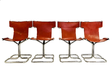 Set of 4 chairs designed by Guido Faleschini in the 70s. Chromed tubular steel frame and brown leather seat. Good general condition with normal signs of time, only one has a defect, as shown in the photo.