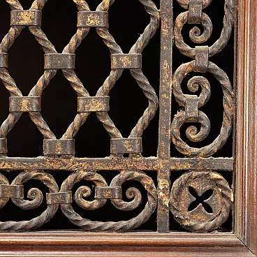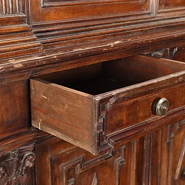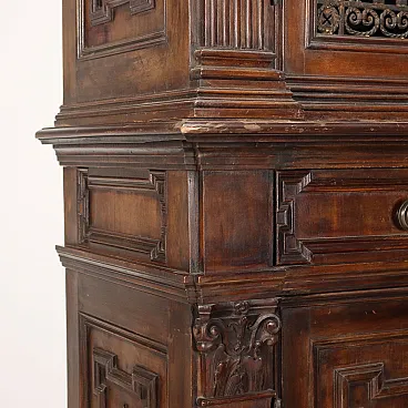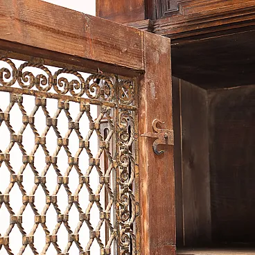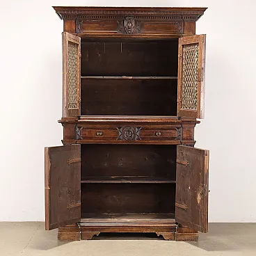 Double top cupbpoard in Neo-Renaissance style in silver fir. Italy, 20th century. Upper part equipped with a pair of doors with iron grate bearing traces of gilding; lower body with pair of drawers in the band and pair of paneled doors. Carved with Renaissance style elements, such as pilasters with capitals, cartouche and face. Front and sides decorated with frames and mouldings. Fir interior.