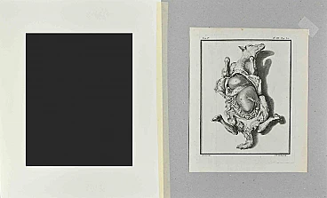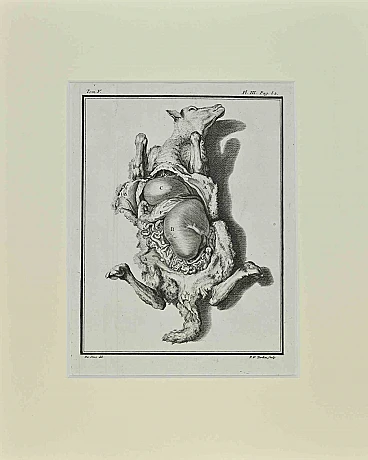 The dissected calf is a work of art made by Jacques de Seve in 1771. Etching B./N. printed on ivory paper. Signed on plate in lower left margin. The work is pasted on cardboard. Overall dimensions: 35x28 cm.The work belongs to the suite "Histoire naturelle, générale et particulière avec la description du Cabinet du Roi." Paris: Imprimerie Royale, 1749-1771. In good condition except paper yellowed by time.
