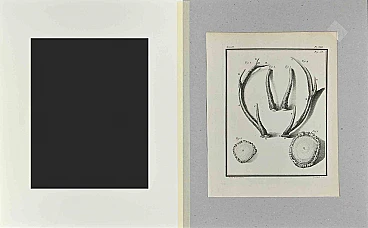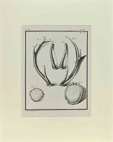 Deer horns is an artwork realized by Buvée l'Américain in 1771. Etching B./W. print on ivory paper. Signed on plate on the lower left margin.The work is glued on cardboard. Total dimensions: 35x28 cm.The artwork belongs to the suite "Histoire naturelle, générale et particulière avec la description du Cabinet du Roi". Paris: Imprimerie Royale, 1749-1771. In good conditions except for the paper yellowed by time.