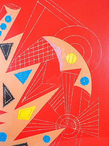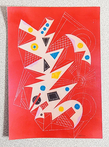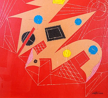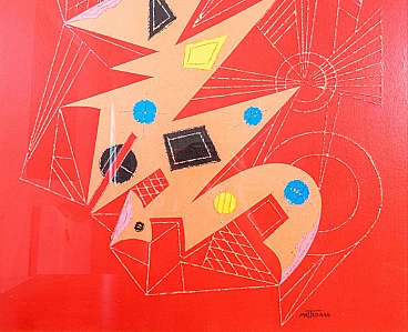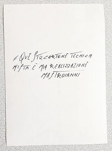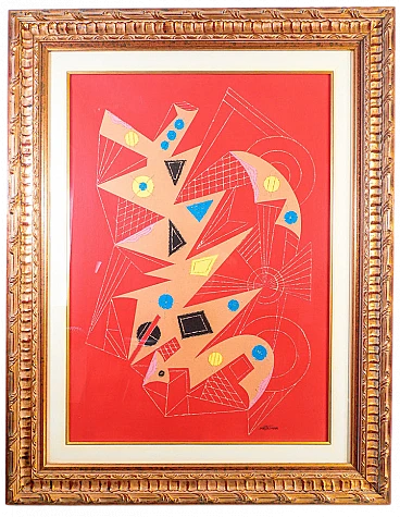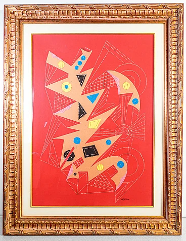 Mixed media painting on cardboard by Umberto Mastroianni depicting an abstract-geometric composition, 1970s. Signed. Complete with authentication. Size without frame: 72 x 51 cm. Umberto Mastroianni, born on 21 September 1910 in Fontana Liri and died on 25 February 1998 in Marino, was an Italian sculptor, painter and partisan. Arriving in Rome in 1924, he honed his sculptural skills under the guidance of Michele Guerrisi in Turin. He initially distinguished himself with pre-war works of mythological and religious subjects. During the war, he participated in the Resistance, an experience that profoundly influenced his subsequent art. He was the first Italian abstract sculptor, then evolving towards informal art in the 1950s. He has received numerous awards, including the Feltrinelli Prize from the Accademia dei Lincei in 1973. His works are exhibited in over 280 museums around the world.