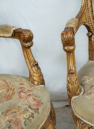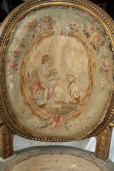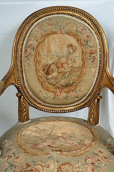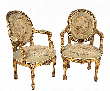 Description: Pair of Napoleon III armchairs in gilded and carved wood belonging to the second half of the 19th century. The circular backrest features a geometric pattern carving and has an Aubusson fabric in the center with a gallant scene in the center. The two armrests have a curvilinear shape and are connected to the seat via a leaf carving. The truncated cone-shaped feet are connected via a mixtilinear apron with a garland in the center. Fabric conditions: Original of the time, but worn by time. Wood condition: Not restored, but in good condition. Provenance: 19th century France. Measurements: 67x60 H105cm. Document: Certificate of Authenticity Assistance: We are at your disposal for further clarifications or photographic details Shipping: Throughout Italy, Europe and the rest of the world at very low prices with maximum safety and traceability. Shipping will be agreed privately and will not be expensive We wish you a good day Borrelli Antiquities.