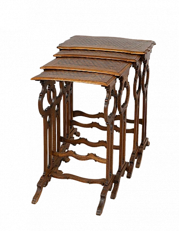 Four small walnut nesting tables with inlaid tops in geometric patterns. The four small tables are set into each other precisely to reclaim as much space as possible. The tops are curved with a geometric inlay in the centre surrounded by an inlay of racemes and flowers. The feet are fratinato and are connected by a mixtilinear cross. Unrestored, but in excellent condition. Provenance: 19th century France. Measurements: 58x38 cm, H 76 cm. Certificate of Authenticity. We are at your disposal for further clarification or photographic details. Shipping throughout Italy, Europe and the rest of the world at very low prices with maximum security and traceability. Shipping will be agreed privately.