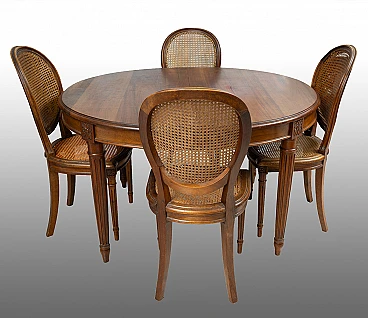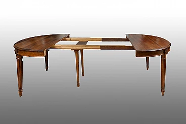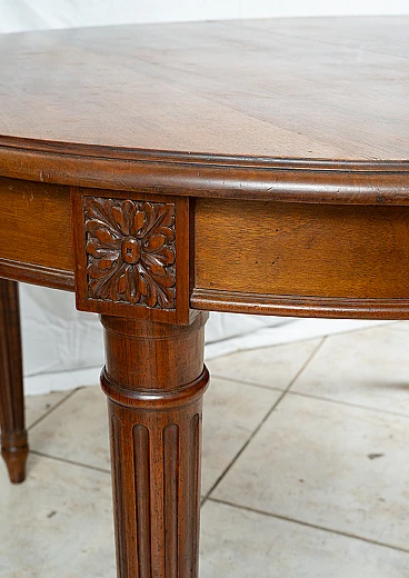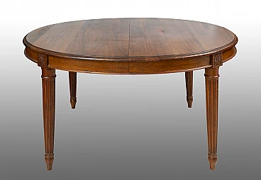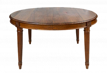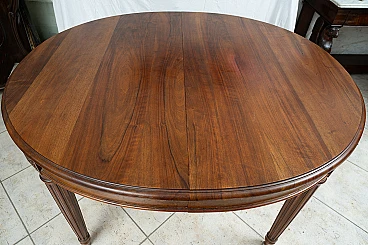 French Napoleon III solid walnut table from the end of the 19th century. The oval-shaped top is supported by four scalloped feet connected to the undercounter band at the carving with flowers. The table can be extended to a length of 250 cm. Possibility of matching six chairs with the table. Provenance: France (1870/90). Measurements: 127x114 cm, H 76 cm. Certificate of Authenticity. We are at your disposal for further clarifications or photographic details. Shipping throughout Italy, Europe and the rest of the world at very low prices with maximum security and traceability. Shipping will be agreed privately.