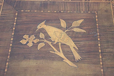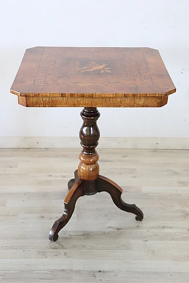 The table is made with a square top supported by an elegant turned central stem supported by three feet. Characterized by a refined inlay decoration made with small pieces of precious woods of different essences. The decoration of the top is grandiose with geometric elements and a little bird in the center. Typical coffee table from the famous Rolo factory (Reggio Emilia) made famous for its precious inlay work. A small but precious antique table that can be used in every room of the house. Used, in perfect condition.