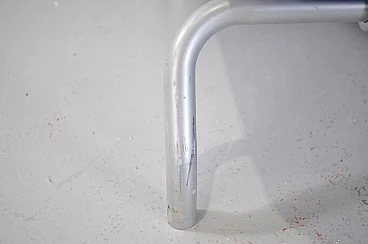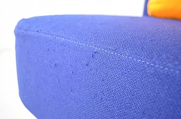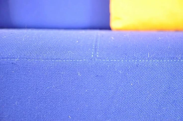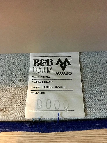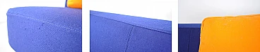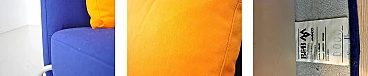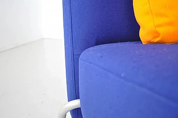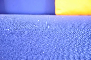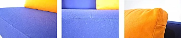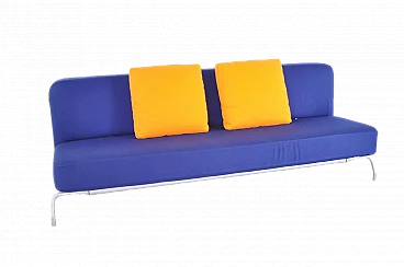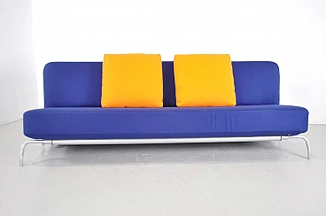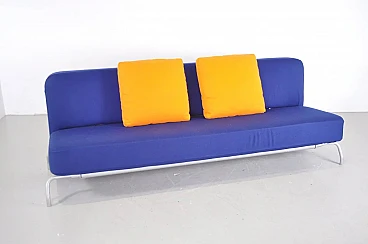 Lunar sofa bed by James Irvine for B&B Italia in Maxalto blue cotton. Very good condition with moderate signs of use; a few small holes on the fabric, signs of use and pilling. The seat and lounging surface are in very good condition. The color of the sofa and cushions is in bright, light shade. Comes with the two matching orange cushions (Maxalto brand, whose label is torn off, not visible). This is a work by London designer James Irvine (1958-2013); a project created in 1997 and presented at the Milan Fair. Epoxy powder-coated aluminum die-cast tubular structure in ALU gray, circular LEM legs and contact tips. The seat and backrest, both composed of a single element padded with cold-molded polyurethane foam, offer unparalleled comfort, while the original fabric of the time, is in a soft, textured bright blue cotton by Maxalto, whose tactile pleasantness adds a touch of luxury and authenticity to the design. The Lunar sofa is a work of art that embodies the design of the 1990s. Its technological specialty makes it truly special: the mechanism to lower the backrest transforms this design marvel into a spacious and comfortable bed for two, making it perfect for your needs at home. Seat height: 41 cm. Seat depth: 55 cm. When open it measures 210 x 130 cm.