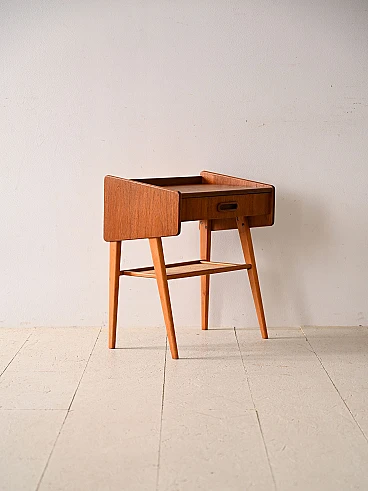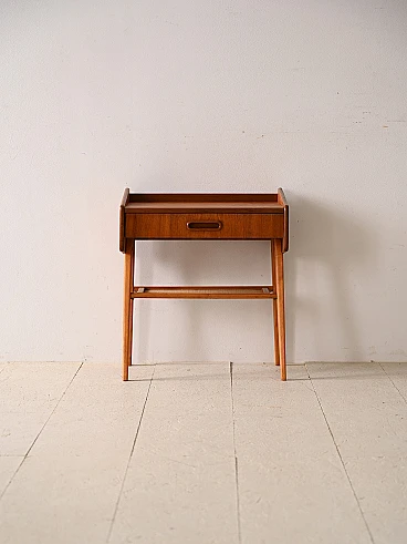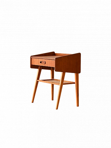 Scandinavian teak, birch and rattan bedside table, 1960s-70s. Made of fine teak wood, this nightstand embodies the distinctive style of the era. It features a drawer with a carved wooden handle that provides storage space for small essentials. Slender legs, angled slightly forward and made of light birch wood, give a light, modern touch to the piece of furniture. A rattan teak-framed magazine rack shelf adds a natural element and vintage feel to the nightstand, providing additional space for books or magazines. Perfect next to the bed or as an addition to a cozy corner of the home, this nightstand combines function and style impeccably. Good condition; it has been restored conservatively with natural products. It may show some signs of time. Please pay attention to the photographs.