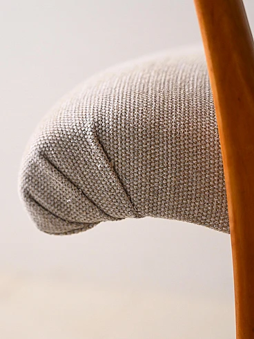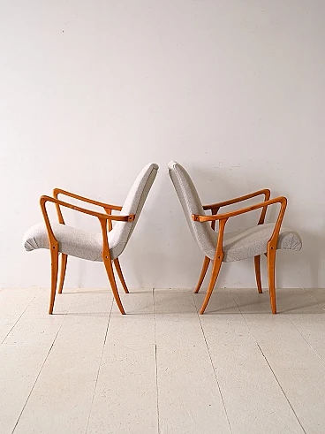 Pair of Scandinavian wood and fabric armchairs, 1940s. Featuring a wooden structure with flowing, harmonious curves that perfectly complement the padded seat upholstered with light-colored fabric. This bright fabric adds modernity and lightness to the overall design, creating a harmonious contrast with the warm tone of the wood. Scandinavian armchairs are renowned for their timeless comfort and style, and this pair is no exception. Perfect for creating a cozy corner in the living room, dining room or even bedroom, they are a charming and functional addition to any room. Good condition; conservation restoration has been done with naturally sourced products. They may show some signs of time. Please pay attention to the photographs.