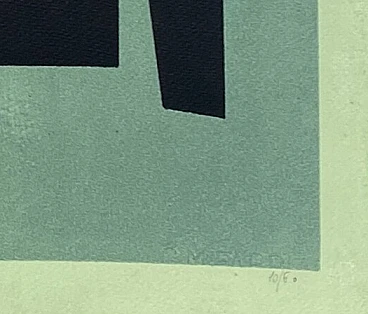 Untitled lithography by Mauro Reggiani (Nonantola, 1897 – Milan, 1980). Five-color lithography, abstract composition. Signed in pencil lower left and numbered lower right 10/60. Bright colors. Excellent state of conservation, except for the presence of foxing visible on the back. Watermark: C. M. Fabriano. A painter with great technical and compositional skills, Reggiani began his studies at the Royal Institute of Fine Arts in Modena. In 1920 he enrolled at the Royal Institute of Florence where he met the painter and sculptor Giuseppe Graziosi (Savignano sul Panaro, 1879 – Florence, 1942) who introduced him to the Milanese environment. Here he frequented artists such as Pietro Marussig (Trieste, 1879 – Pavia, 1937) and Achille Funi (Ferrara, 1890 – Appiano Gentile, 1972); the Lombard environment pushed him to move away from a certain academicism in favor of abstract form. Relations with the Galleria del Milione in Milan became increasingly closer; the artists who gravitated there were engaged in abstract research on the geometric module. The canvas became for Reggiani a space in which to gravitate pure, measurable geometric shapes, characterized by bright and bright colours, the latter being a distinctive trait of the author. In 1973 a solo show was dedicated to him at the Palazzo dei Diamanti in Ferrara and in 1977 in Turin at the Galleria Civica d'Arte Moderna. In 1965 he won first prize at the Venice Biennale and first prize at the Rome Quadrennial. Bibliography: Mauro Reggiani - l'opera grafica 1934-1980. Centro internazionale della grafica, Venice, 1983.