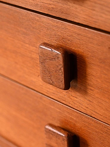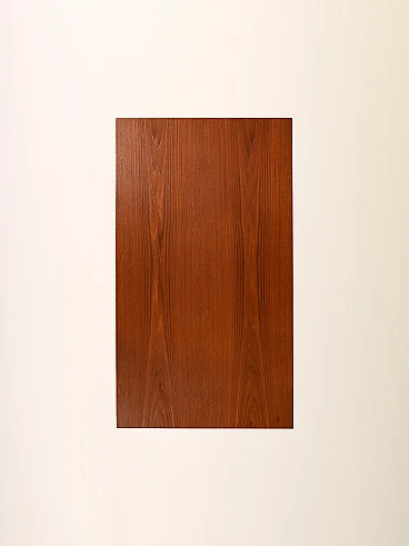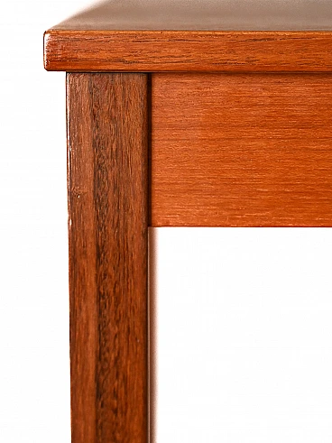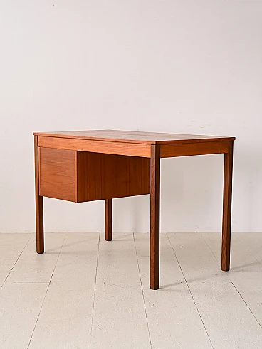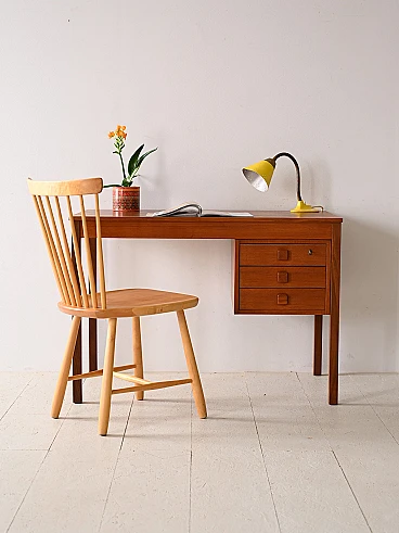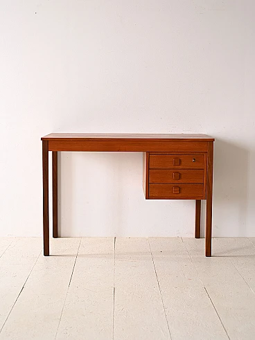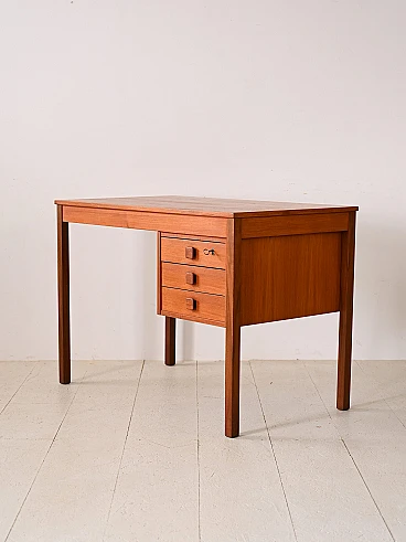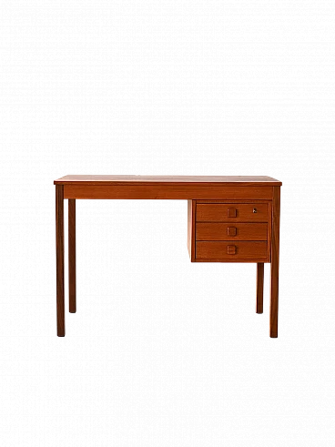 Teak desk by Domino Møbler (Denmark) with three side drawers, 1960s. This charming piece of furniture embodies the simplicity and practicality typical of Scandinavian design. The compact structure and minimal lines give the desk a light, modern look that is perfect for smaller spaces. The rectangular top provides a large work area, while the three drawers on one side provide storage space to organize documents, stationery and other personal items. The square wooden handle of the drawers adds a touch of character and craftsmanship to the cabinet, with the first drawer equipped with a lock to protect treasured possessions. Ideal for those looking for an original and classy piece of furniture for their home office or study, this Scandinavian desk will become the focal point of the room. Good condition; a conservation restoration has been done with natural products. It may show some signs of time. Please pay attention to the photographs.
