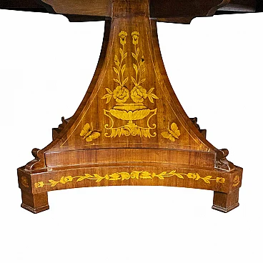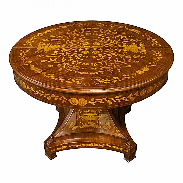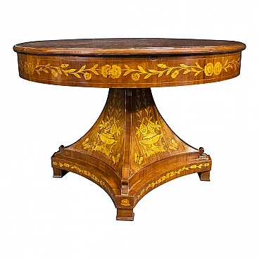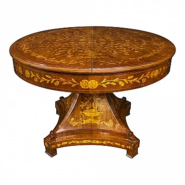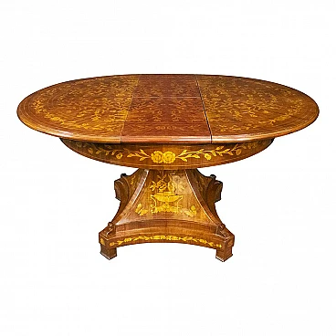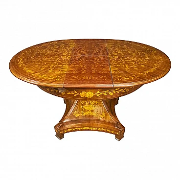 20th century circular table made of richly inlaid wood, complete with extension leaf. Closed table dimensions (ØxH) 115 x 77 cm, extended table dimensions (WxDxH) 150 x 115 x 77 cm.