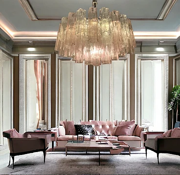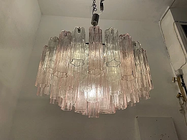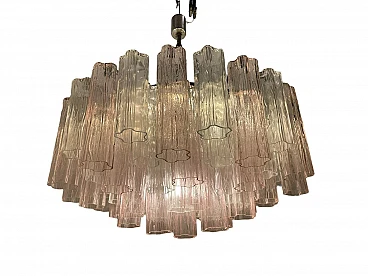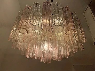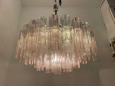 Large chandelier in pink and transparent Murano glass by Paolo Venini. Price - € 2 100.00 per item. Italian style, design and production period 1970s. This piece was designed in the style of the selected designer and/or manufacturer. The chandelier consists of 60 pink and transparent Murano glass tubes. Height with chain and ceiling canopy 90 cm, height without chain and ceiling canopy 40 cm, width 75 cm. Features nine lights. Requires eight E14 bulbs and one E27 bulb. New wiring compatible with UK, Europe and USA. Weight between 40 kg and 80 kg. Very good condition, this vintage/antique item is faultless, but may show slight traces of use. Slight wear consistent with age and use, electrical components rewired and/or new. Is this piece functional? Yes, I had the piece rewired by a professional electrician.