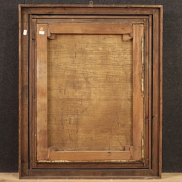 and the use of the chiaroscuro technique are noteworthy in a painting where the figures stand out brightly in the center of the composition while the rest remains in darkness. 20th century frame in carved and gilded wood, beautifully decorated, with some signs of aging (see photo). Painting that has undergone conservative restoration with color recovery in some places (see photo). Overall, it is in a good state of conservation. Painting light H 91.5 x W 70.5 cm.