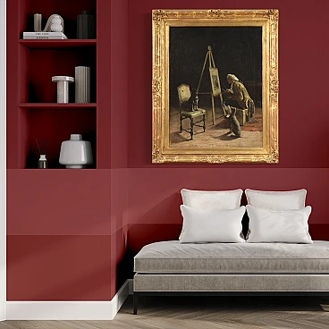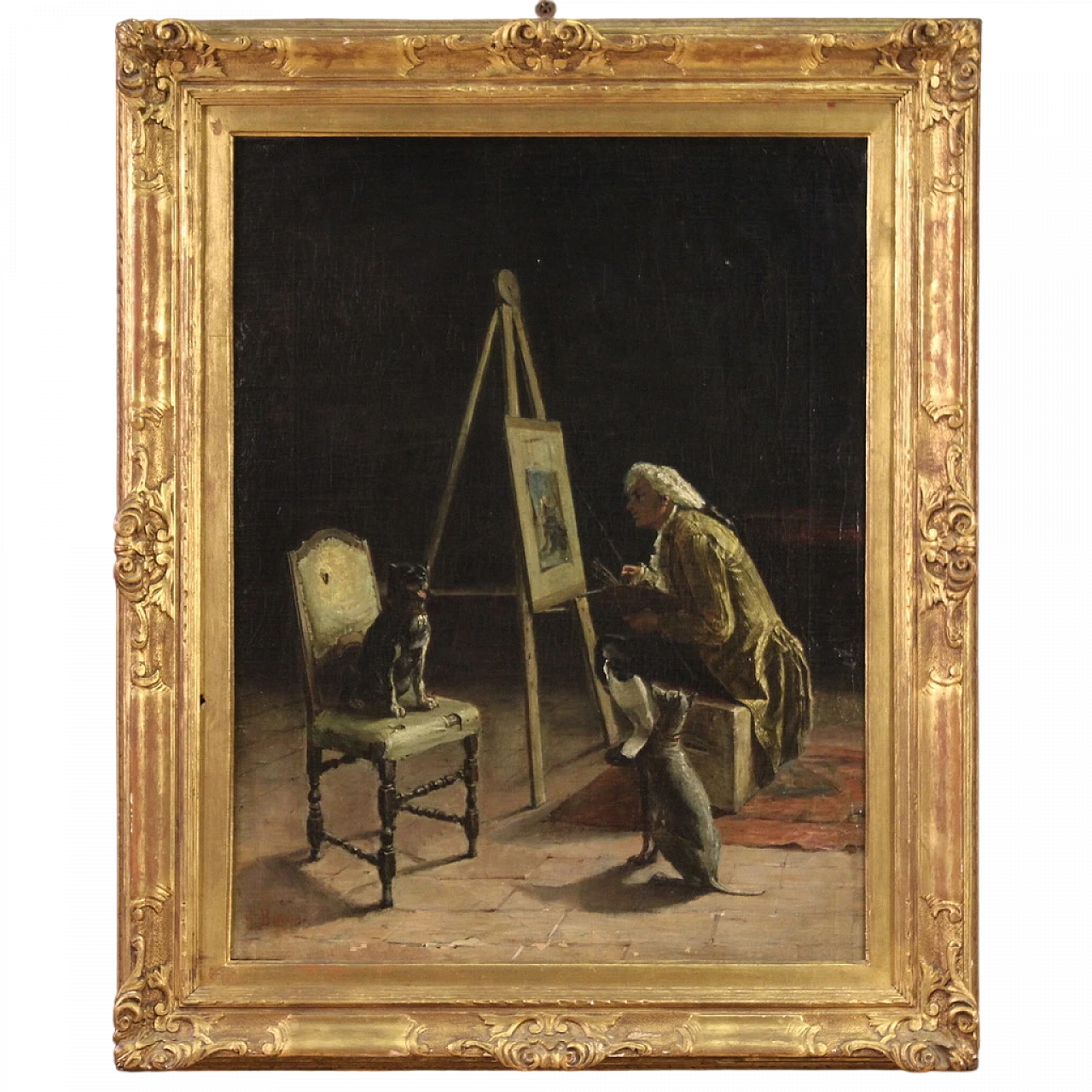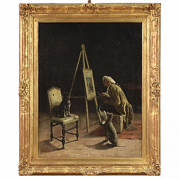 Oil on canvas work signed G. Bottero on the bottom left, referable to the Italian painter Giuseppe Bottero (1846-1930), lacking authentication. A painting with a curious and at the same time witty subject, we find a painter in eighteenth-century Venetian clothes portraying a dog in his studio. Large oil painting on canvas, first canvas, of notable pictorial quality. In fact, the naturalistic details