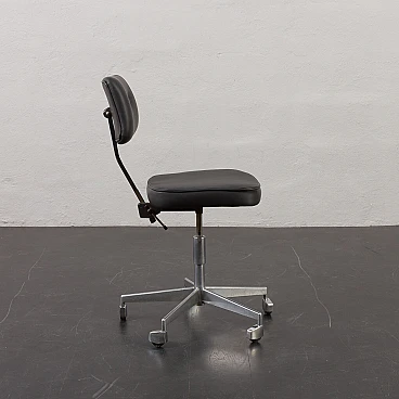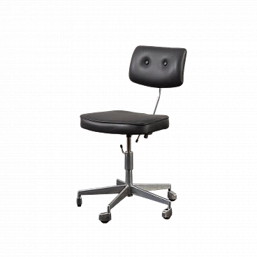 Chromed metal and black leather office chair by Labofa (Denmark), 1960s. It would make a great addition to any desk, whether modern or Mid-Century style. The manufacturer's trademark has been preserved, validating its originality. Made with an elegant chrome frame and casters, it easily rotates 360 degrees, providing comfort while working. It has multiple options to adjust the height, backrest and inclination, all to meet the different needs of those who sit. It has a new black leather and foam covering, which increases its comfort and elegance. It has been carefully checked: all mechanisms work properly. Small signs of use have been left which do not ruin its aesthetics but only confirm its originality. Excellent vintage condition with minor traces of use, beautiful patina and new upholstery. Seat height: 55.5 cm.