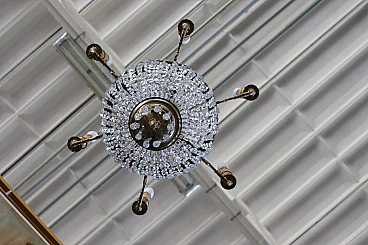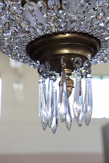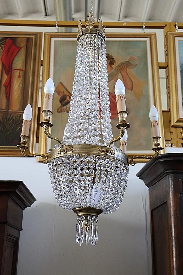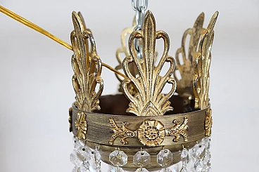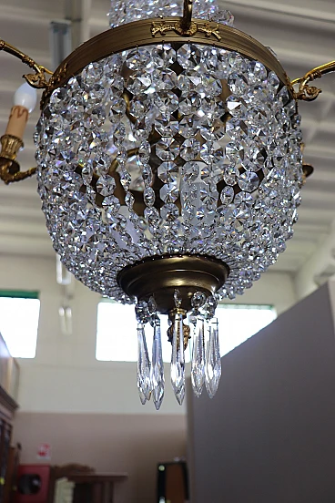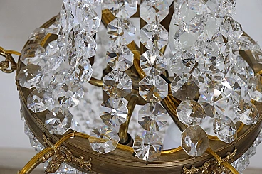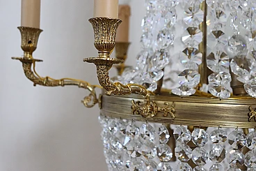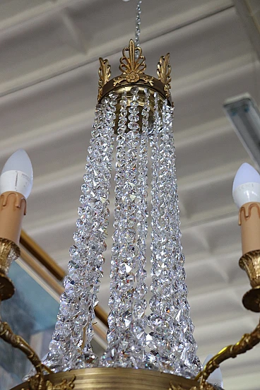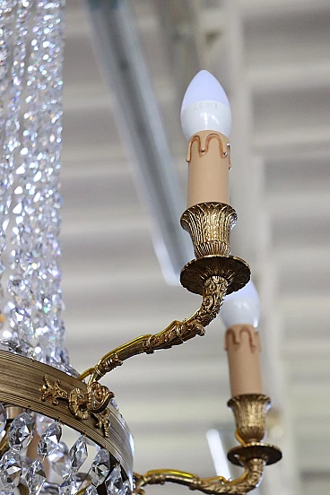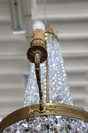Refined Empire-style chandelier made of gilt bronze and crystals, late 19th century. Equipped with ten lights of which six on the outer circumference and four illuminating the inside. Called "balloon chandelier" because of its typical shape. Made of gilded bronze and completely covered with crystal droplets. The bronze features fine chiseled decoration. The crystal exudes the typical luminosity and the droplets are finely faceted. Used but in perfect condition. New electrical system. However, we recommend that you take a good look in detail at all the attached photos. Offered at an excellent negotiable price, please send us your suggestions for purchase which we will gladly consider.