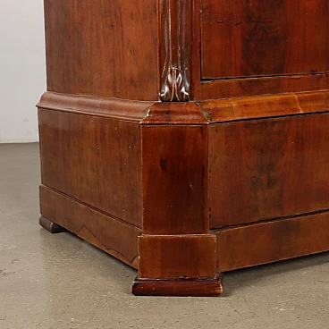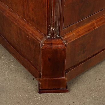 Chest of drawers in mahogany veneer and mahogany feather on the front, Naples third quarter 19th century. White marble top, front with four drawers, one of which in the band, uprights at forty-five degrees with pilasters decorated with a rococo style element, carved floral and leaf festoons. Lower plinth section. Poplar interior.