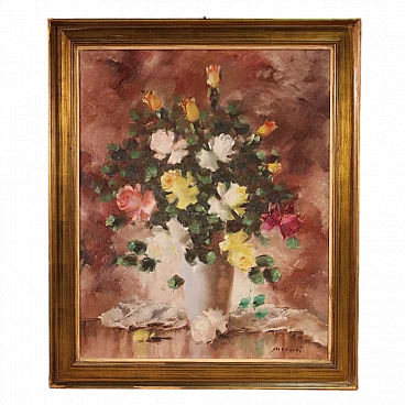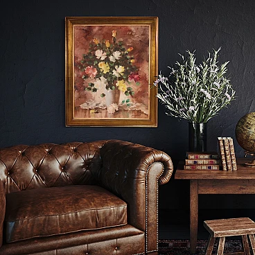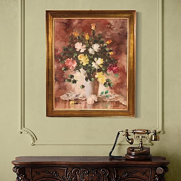 Acrylic work on canvas depicting still life, vase with flowers, of good pictorial quality. Frame from the second half of the 20th century, in wood and plaster, carved and gilded with beautiful decoration. Painting that develops vertically, of good brightness, characterized by warm colors, with pleasant decor. Work signed lower right Mancini (see photo), signature under study. Painting of excellent proportions, easily placed in different parts of the house, in good state of conservation. Light painting H 99 x W 80 cm.