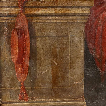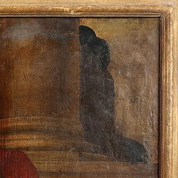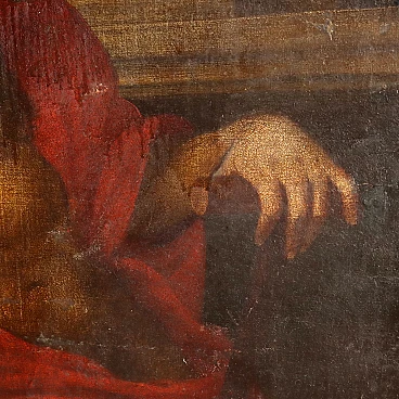 Oil painting on canvas. Italian school of the 17th century. The Saint is depicted inside his study, intent on reading and studying the sacred texts, but in penitential garb, i.e. clad only in a red cloth draped around his naked body. The painting, relined, has a significant crack. It is placed in a contemporary gilded wooden frame.