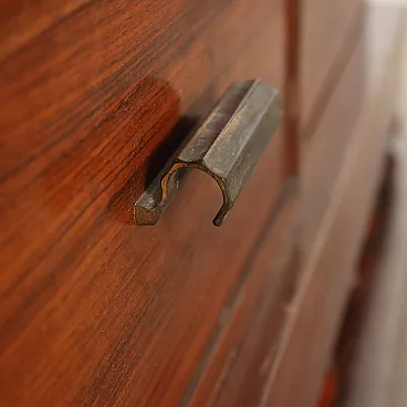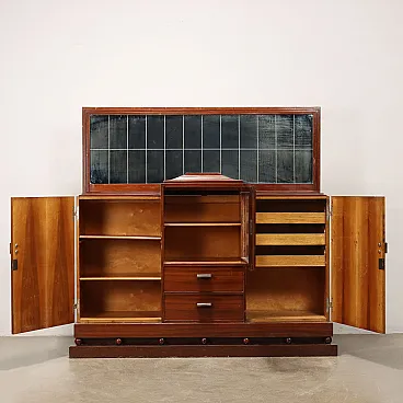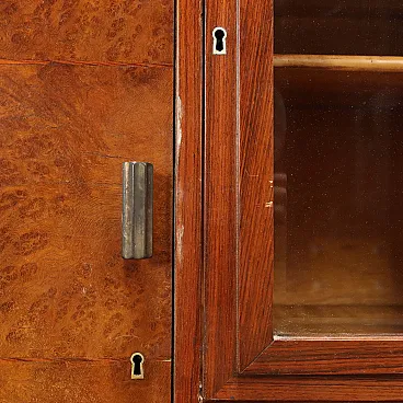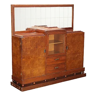 Sideboard with mirror, small central display case and visible drawers, doors with hinged opening, in walnut and briar veneer. 1920s-1930s.