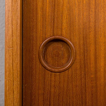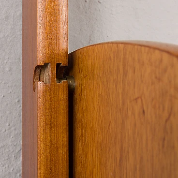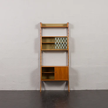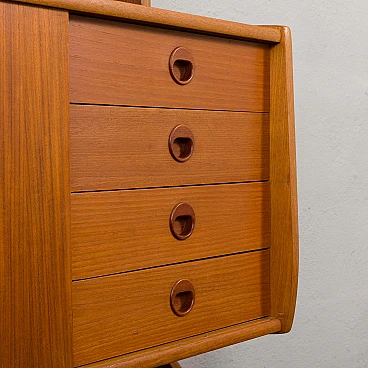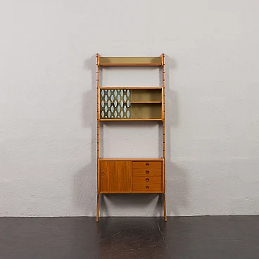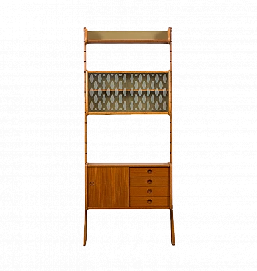 Teak Ergo bookcase by John Texmon for Blindheim Mobelfabrikk (Norway), 1960s. It features an upper shelf, a cabinet with internal shelves and a beautiful display case with sliding doors. This is a fully modular shelving system called "Ergo de lux", designed by Texmon for Blindheim Mobelfabrikk. The gently curved edges give a warm impression and the sculptural posts create an elegant and impactful statement. The cabinet with drawers features a single internal shelf for storing organized items. The display case consists of two glass doors and an internal shelf, perfect for displaying decorative objects. The "winged" shelf offers additional display space with its unique design. Two uprights provide structural support and add aesthetic appeal to the set. The modularity of this piece of furniture represents a significant advantage, as it allows for versatile arrangement and customization based on individual preferences and space needs. The display case is 43 cm high, 78.5 cm wide and 24 cm deep. The cabinet with drawers is 43 cm high, 78.5 cm wide and 35 cm deep; the four drawers have an internal height of 8 cm each. The shelf is 21 cm high and 78.5 cm wide. The two uprights are 203 cm long. The furniture has been checked: all doors and drawers work properly. You can find a stamp on the back of the chest of drawers, which helps confirm that it is an original piece. It is in fantastic condition.