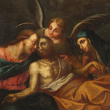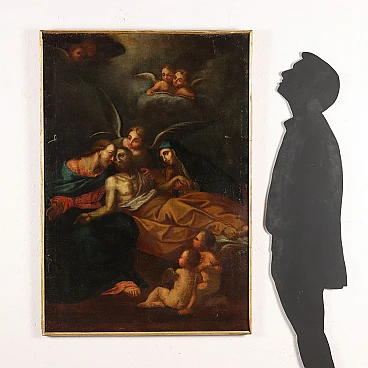 Oil painting on canvas. Italian school of the 18th century. The painting depicts the death of Saint Joseph which, according to the apocryphal gospels, occurred assisted by Mary and Jesus: the dying man lies in fact in his bed of agony, supported affectionately by his putative son Jesus and his wife Mary, while several angels assist, both at the foot of the bed, or from above where the heavens already open to welcome the soul of the saint. Joseph's is considered the most desirable and peaceful form of death, of old age, in one's bed and surrounded by one's loved ones, and for this reason the Saint is considered the patron saint of the dying and of sweet death. Restored and relined, the painting is presented with a frame.