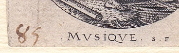 Burin engraving "Musique" by Etienne Delaune (Paris, 1519 – Paris, 1583), 1569. Delaune was a French designer, goldsmith and engraver remembered as a medalist. He began to devote himself to engraving in 1557 by executing a series of twelve plates illustrating the Old Testament. He was an engraver translating from the models of the Italian artists of the Fontainebleau school such as Rosso Fiorentino, Nicolò dell'Abate and above all Luca Penni. Calvinist involved in the events of the night of St. Bartholomew, he was forced to leave Paris in 1572. He will be active in Augsburg and Strasbourg. His engravings have a format and style that is influenced by his training as a goldsmith. Table no. 10 of the series of twelve entitled "Suite des Arts Libéraux". To the depictions of the seven liberal arts, we add Physics, Jurisprudence and Theology, an allegory of Minerva and one of Wisdom. Inside an oval, a full-figured woman, with her breasts exposed and a flowing dress, is busy playing the cymbals. Sheet music and musical instruments surround her, on the right a vine hedge closes the scene, on the left a small house with a man and a dog, beyond on the sea a sailing boat with a man. The series derives from the lost models of Baptiste Pellerin. Delaune's models were very widespread at the time, they were used as models for enamels in Limoges, wood carvings or lapis lazuli (now in the Louvre). Inside the oval engraved "SF 1569"; beyond the oval at the bottom left "85", in pen in ancient script at the bottom left. Excellent impression, intense blacks. More complete example than those preserved in the British Museum and the Victoria and Albert. Excellent state of conservation, minimal margins. Bibliography: Robert-Dumesnil 1865, IX, 56.176. Le Blanc, 1856 II, p. 504, n. 156-171. Julie Rohou, La Fabrique des modèles: Etienne Delaune et les arts décoratifs de la Renaissance. Pollet, Christophe, Les gravures d'Etienne Delaune, doctoral thesis under the direction of Professor Albert Châtelet, Strasbourg, Université des Sciences Humaines, 1995 (T.I, p. 441-442).