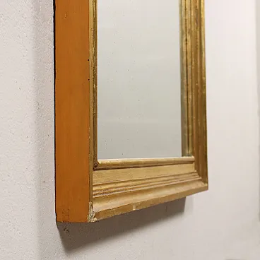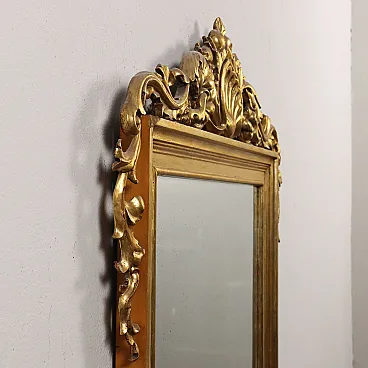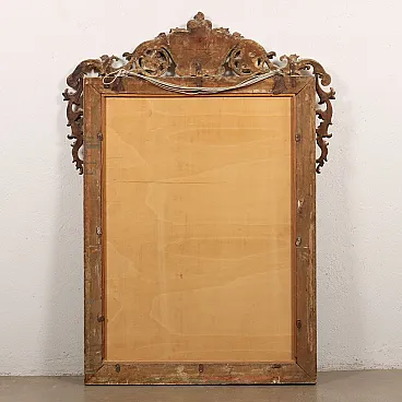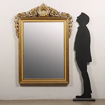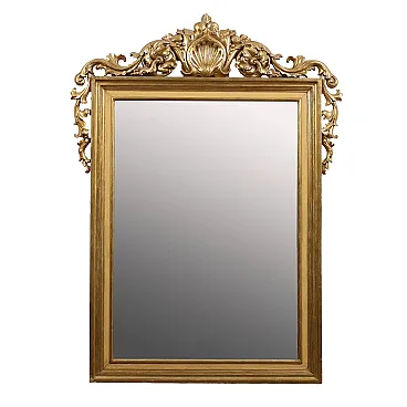 Mirror adorned with a carved and perforated cymatium with a central shell from which leafy spirals branch out. It was subsequently re-gilded and re-lacquered.