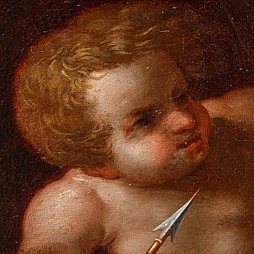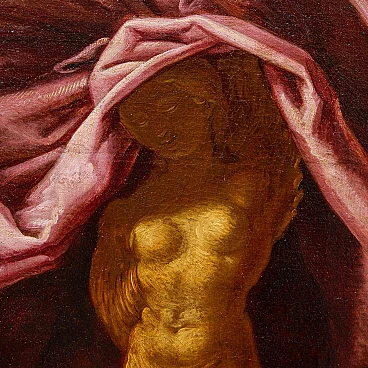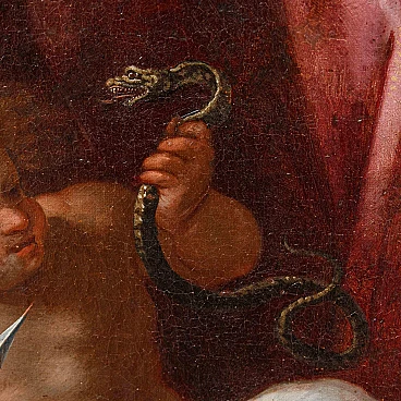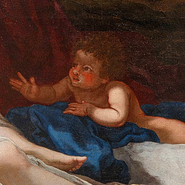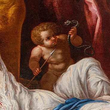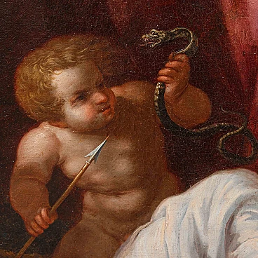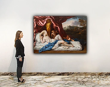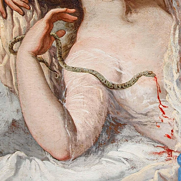 Nicolas Pierre Loir (Paris, 1624-ivi, 1679), attr. Cleopatra undergoing the bite of the asp, oil on canvas, 124 x 172 cm, framed 140.5 x 188 cm. An honourable death, that of Cleopatra, who did not wait for the disastrous outcome of the civil war to which Mark Antony dragged Ptolemaic Egypt. In the present painting the asp is duplicated, agonising on one side in the queen's blood and clutched, on the other, in the hands of an incredulous putto-helper, heir to the classical iconographic tradition. The pose of Cleopatra, borrowed from the type of the sleeping Ariadne, for which a realistic prototype can be recognised in the sculpture housed in the Vatican from 1779 onwards, can also be traced back to the same context, to which the gilded sculpture behind the bed representing a siren with her wing-arm raised above her head should also be traced. Acquired in 1512 by Pope Julius II for the Courtyard of the Statues of the Belvedere, Cleopatra herself was mistakenly identified in this work on account of a snake armlet. Correctly identified as the Cretan maiden by Ennio Quirino Visconti, the Ariadne was later universally admired by artists on the Grand Tour. Among them was Nicolas Pierre Loir, to whom this painting can be traced and who came into contact with the papal art collections. Coming from a family of goldsmiths, Nicolas Pierre Loir had notable masters from the beginning, such as Sébastien Bourdon and Simon Vouet. The inevitable Italian sojourn fell between 1647 and 1649, thanks to the direct interest of the embassy secretary André Félibien. His meeting with the knight collector and traveller Cassiano dal Pozzo, a Roman by adoption in the papal retinue, who opened his own collection to Loir's eager eye, led to the discovery of the works of Nicolas Poussin, abundant in Cassiano's cabinet. Loir was then convinced of the need for an Italianising landscape for his own paintings, also treasuring the compositional suggestions of Gaspard Dughet, who was already in close contact with Poussin through family connections. Returning to his homeland in 1650, Nicolas Pierre devoted himself actively to the Company of Goldsmiths and, consequently, to the so-called minor arts for the cathedral of Notre-Dame in Paris. Having been privately commissioned by Henri du Plessis-Guénégaud and his château in the vicinity of Villeroy, the artist followed up his commitments as a professor first and then rector of the Royal Academy of Painting and Sculpture in the capital (1663), thanks to the support of Charles Le Brun and King Louis XIV himself, by executing a series of seven canvases at the flat of Queen Marie-Thérèse of Austria. Having obtained the life-long support of the royal pension, Loir was also able to approach the textile art of the Gobelins Manufacture for the château of Saint-Germain-en-Laye in the Tuileries. A master in turn of François de Troy, who adopted the typical Poussinian blue of the palette, Loir lavished a perfect series of paintings with mythological or historical archaic subjects. From this point of view, the present Cleopatra draws heavily from Loir's Classical pronunciation, drawing obvious affinities with other autograph paintings of his, such as the Allegory of the Founding of the Royal Academy of Painting and Sculpture (Versailles, châteaux de Versailles et de Trianon), Pithopolis Serves Golden Plates to King Pithès (Bourg-en-Bresse, Musée de Brou) and The Queen Addresses the Soldiers (Paris, Musée du Louvre).